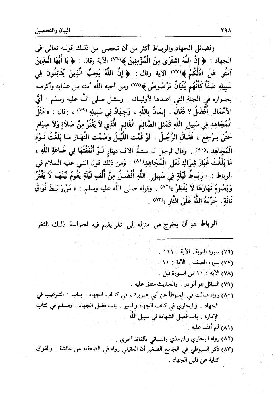 وفضائل الجهاد والرباط أكثر من أن تحصى من ذلك قَوْله تَعَالَى في الجهاد: {إِنَّ اللَّهَ اشْتَرَى مِنَ الْمُؤْمِنِينَ} [التوبة: 111] الآية وقال: {يَا أَيُّهَا الَّذِينَ آمَنُوا هَلْ أَدُلُّكُمْ} [الصف: 10] الآية وقال: {إِنَّ اللَّهَ يُحِبُّ الَّذِينَ يُقَاتِلُونَ فِي سَبِيلِهِ صَفًّا كَأَنَّهُمْ بُنْيَانٌ مَرْصُوصٌ} [الصف: 4] ومن أحبه الله أمنه من عذابه وأكرمه بجواره في الجنة التي أعدها لأوليائه. «وسئل - صَلَّى اللَّهُ عَلَيْهِ وَسَلَّمَ -: أي الأعمال أفضل؟ فقال: إيمان بالله، وجهاد في سبيله» وقال: «مثل المجاهد في سبيل الله كمثل الصائم القائم الذي لا يفتر من صلاة ولا صيام حتى يرجع، فقال الرجل: لو قمت الليل وصمت النهار ما بلغت نوم المجاهد» . «وقال لرجل له ستة آلاف دينار لو أنفقتها في طاعة الله، ما بلغت غبار شراك نعل المجاهد.» ومن ذلك قول النبي - عَلَيْهِ السَّلَامُ - في الرباط: «رباط ليلة في سبيل الله أفضل من ألف ليلة يقوم ليلها لا يفتر ويصوم نهارا لا يفطر» . وقوله - صَلَّى اللَّهُ عَلَيْهِ وَسَلَّمَ -: «من رابط فواق ناقة، حرمه الله على النار» .