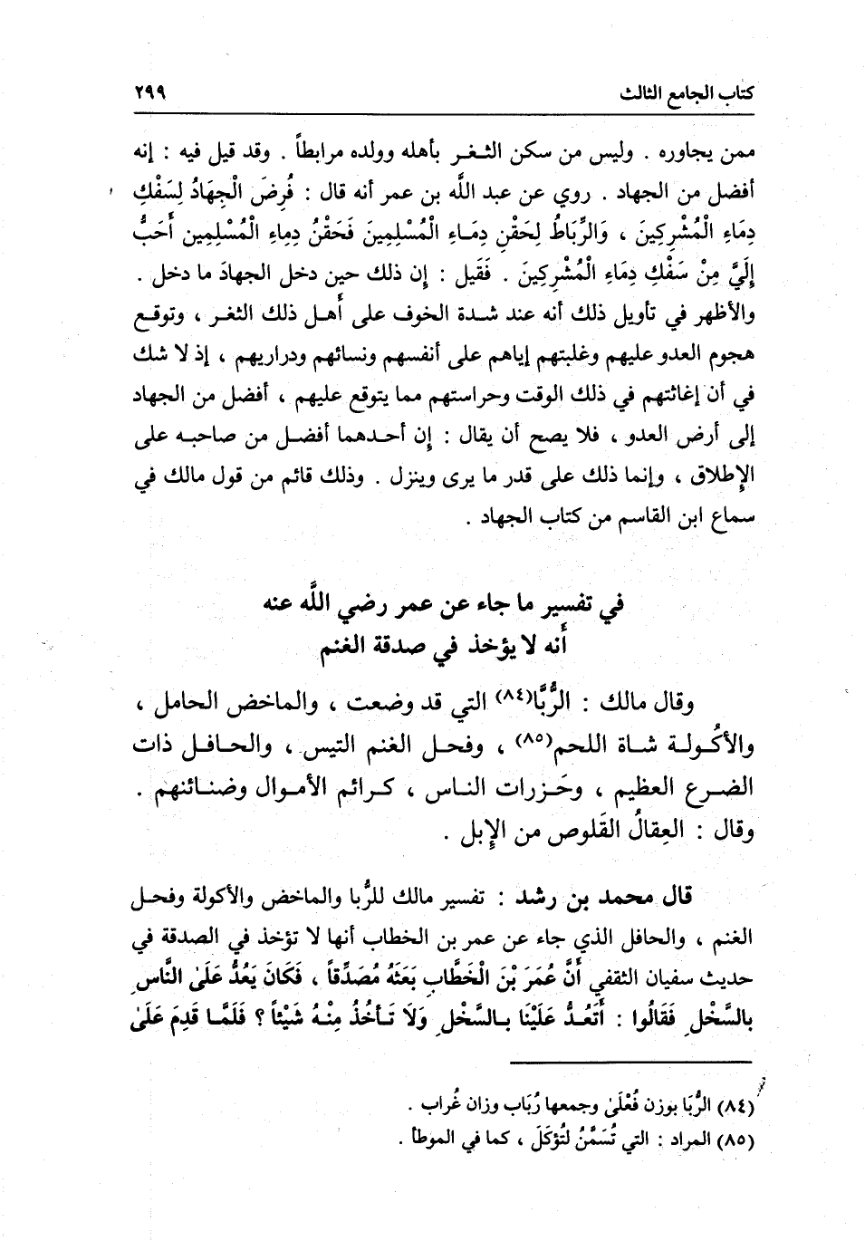 قال محمد بن رشد: تفسير مالك للربا والماخض والأكولة وفحل الغنم، والحافل الذي جاء عن عمر بن الخطاب أنها لا تؤخذ في الصدقة في حديث سفيان الثقفي أن عمر بن الخطاب بعثه مصدقا، فكان يعد على الناس بالسخل فقالوا: أتعد علينا بالسخل ولا تأخذ منه شيئا؟ فلما قدم على