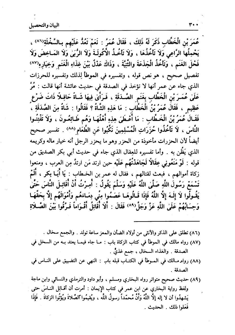 عمر بن الخطاب ذكر له ذلك، فقال عمر: نعم تعد عليهم بالسخلة، يحملها الراعي ولا تأخذها، ولا تأخذ الأكولة ولا الربي ولا الماخض ولا فحل الغنم، وتأخذ الجذعة والثنية، وذاك عدل بين غذاء الغنم وخياره تفصيل صحيح، هو نص قوله، وتفسيره في الموطأ لذلك وتفسيره للحرزات الذي جاء عن عمر أنها لا تؤخذ في الصدقة في حديث عائشة أنها قالت: مر على عمر بن الخطاب بغنم الصدقة، فرأى فيها شاة حافلا ذات ضرع عظيم، فقال عمر بن الخطاب: ما هذه الشاة؟ فقالوا: شاة من الصدقة، فقال عمر بن الخطاب: ما أعطى هذه أهلها وهم طائعون، ولا تفتنوا الناس، لا تأخذوا حزرات المسلمين نكبوا عن الطعام. تفسير صحيح أيضا لأن الحزرات مأخوذة من الحزر، وهو ما يحزر الرجل أنه خيار ماله وكريمه الذي يظن به. وأما تفسيره للعقال الذي جاء في «حديث أبي بكر الصديق من قوله: لو منعوني عقالا لجاهدتهم عليه حين ارتد من ارتد من العرب، ومنعوا زكاة أموالهم، فبعث لقتالهم، فقال له عمر بن الخطاب: يا أبا بكر، ألم تسمع رسول الله - صَلَّى اللَّهُ عَلَيْهِ وَسَلَّمَ - يقول: أمرت أن أقاتل الناس حتى يقولوا لا إله إلا الله، فإذا قالوها عصموا مني دماءهم وأموالهم إلا بحقها، وحسابهم على الله عز وجل، فقال: ألا أقاتل أقواما فرقوا بين الصلاة