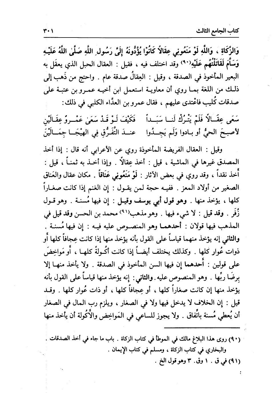 والزكاة، والله لو منعوني عقالا كانوا يؤدونه إلى رسول الله صَلَّى اللَّهُ عَلَيْهِ وسام لقاتلتهم عليه» وقد اختلف فيه، فقيل: العقال الحبل الذي يعقل به البعير المأخوذ في الصدقة، وقيل: العقال صدقة عام. واحتج من ذهب إلى ذلك من اللغة بما روي أن معاوية استعمل ابن أخيه عمرو بن عتبة على صدقات كليب فاعتدى عليهم، فقال عمرو بن العداء الكلبي في ذلك: