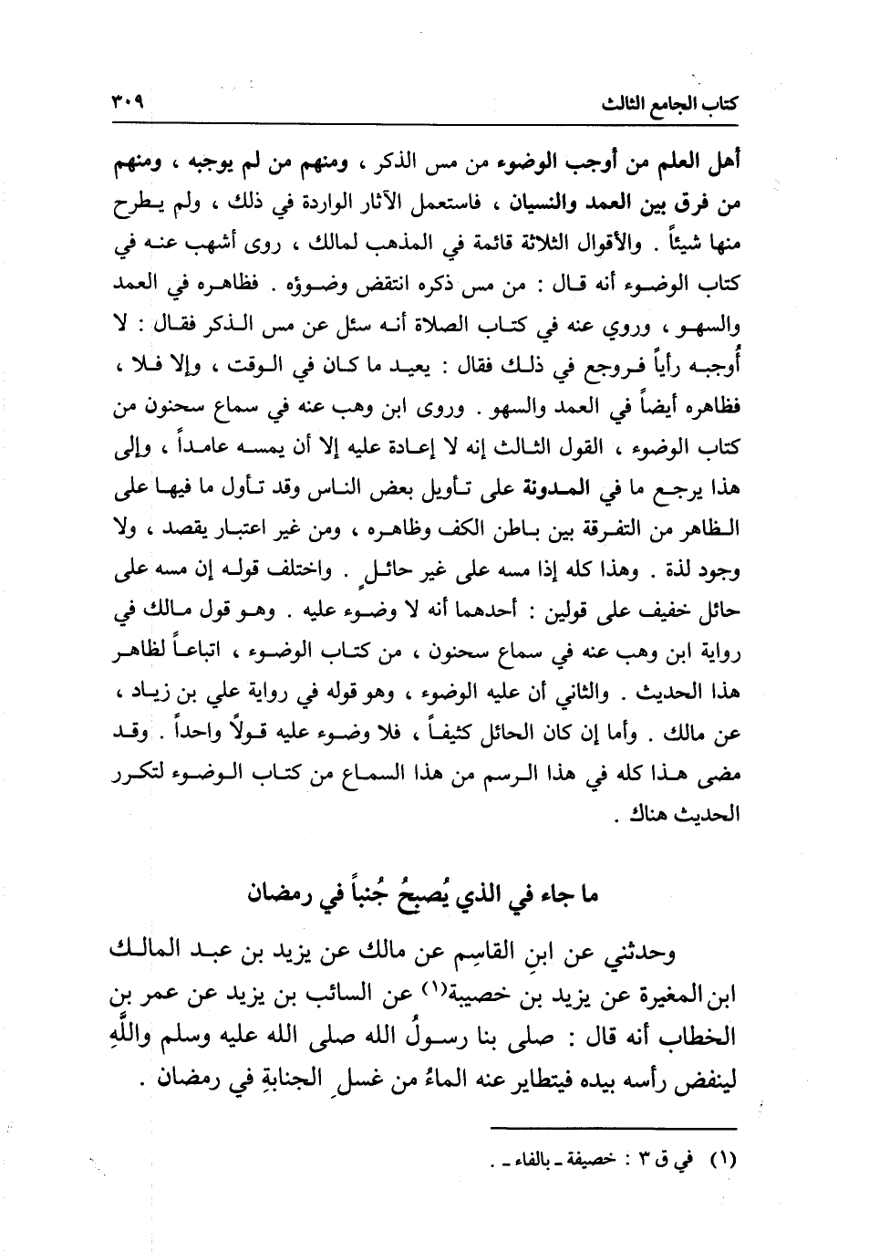 ما جاء في الذي يصبح جنبا في رمضان وحدثني عن ابن القاسم عن مالك عن يزيد بن عبد الملك بن المغيرة، عن يزيد بن خصيبة، عن السائب بن يزيد، «عن عمر بن الخطاب أنه قال: صلى بنا رسول الله - صَلَّى اللَّهُ عَلَيْهِ وَسَلَّمَ -، والله لينفض رأسه بيده فيتطاير عنه الماء من غسل الجنابة في رمضان» .