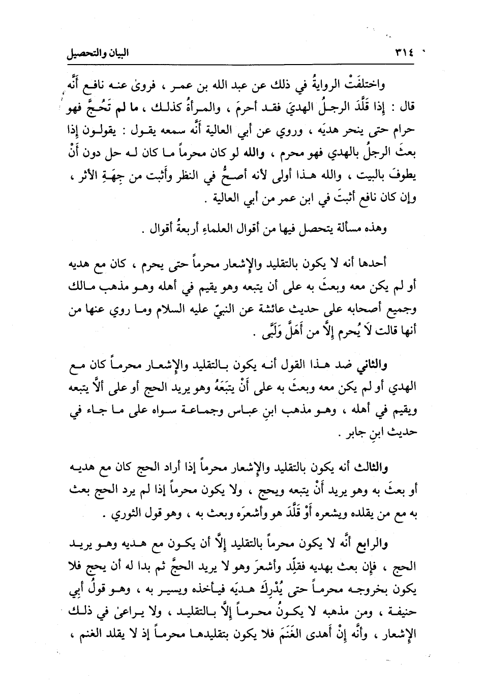 والثالث: أنه يكون بالتقليد والإشعار محرما إذا أراد الحج، كان مع هديه أو بعث به، وهو يريد أن يتبعه وبحج، ولا يكون محرما إذا لم يرد الحج، بعث به مع من يقلده ويشعره أو قلد هو وأشعره وبعث به، وهو قول الثوري. والرابع: أنه لا يكون محرما بالتقليد إلا أن يكون مع هديه وهو يريد الحج، فإن بعث بهديه فقلد وأشعر وهو لا يريد الحج ثم بدا له أن يحج فلا يكون بخروجه محرما، حتى يدرك هديه فيأخذه ويسير به، وهو قول أبي حنيفة، ومن مذهبه لا يكون محرما إلا بالتقليد، ولا يراعى في ذلك الإشعار، وأنه إن أهدى الغنم فلا يكون بتقليدها محرما إذ لا يقلد الغنم،