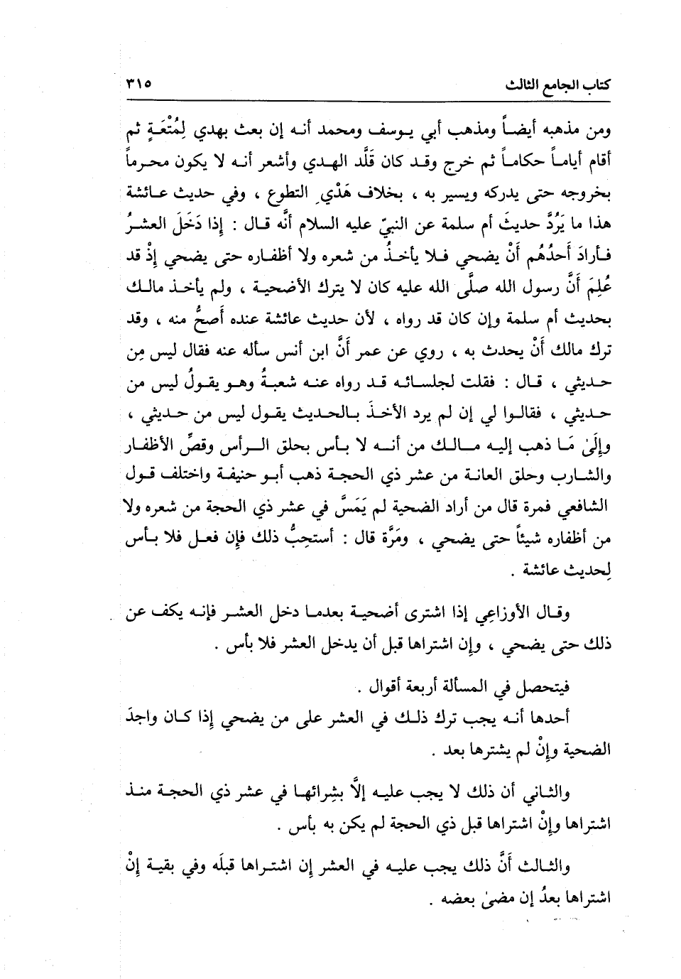 ومن مذهبه أيضا ومذهب أبي يوسف ومحمد أنه إن بعث بهدي لمتعة ثم أقام أياما حكاما ثم خرج وقد كان قلد الهدي وأشعر، أنه لا يكون محرما بخروجه حتى يدركه ويسير به، بخلاف هدي التطوع، وفي حديث عائشة هذا ما يرد حديث «أم سلمة عن النبي - عَلَيْهِ السَّلَامُ - أنه قال: إذا دخل العشر فأراد أحدهم أن يضحي فلا يأخذ من شعره ولا أظفاره حتى يضحي» إذ قد علم أن رسول الله صَلَّى اللَّهُ عَلَيْهِ كان لا يترك الأضحية، ولم يأخذ مالك بحديث أم سلمة وإن كان قد رواه؛ لأن حديث عائشة عنده أصح منه، وقد ترك مالك أن يحدث به، روي عن عمر أن ابن أنس سأله عنه فقال: ليس من حديثي، قال: فقلت لجلسائه قد رواه عنه شعبة وهو يقول ليس من حديثي، فقالوا لي إن لم يرد الأخذ بالحديث يقول: ليس من حديثي، وإلى ما ذهب إليه مالك من أنه لا بأس بحلق الرأس وقص الأظفار والشارب وحلق العانة من عشر ذي الحجة ذهب أبو حنيفة، واختلف قول الشافعي، فمرة قال: من أراد الضحية لم يمس في عشر ذي الحجة من شعره ولا من أظفاره شيئا حتى يضحي، ومرة قال: أستحب ذلك، فإن فعل فلا بأس لحديث عائشة.
