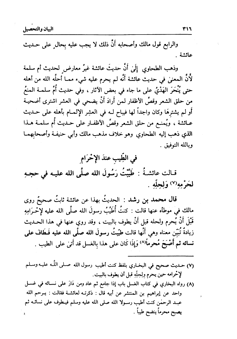 قال محمد بن رشد: الحديث بهذا عن عائشة ثابت صحيح روى مالك في موطأه عنها قالت: «كنت أطيب رسول الله صَلَّى اللَّهُ عَلَيْهِ لإحرامه قبل أن يحرم ولحله قبل أن يطوف بالبيت» وقد روي عنها في هذا الحديث زيادة تبين معناه، وهي أنها قالت: «طيبت رسول الله صَلَّى اللَّهُ عَلَيْهِ فطاف على نسائه ثم أصبح محرما، وإذا كان على هذا بالغسل قد أتى على الطيب» .