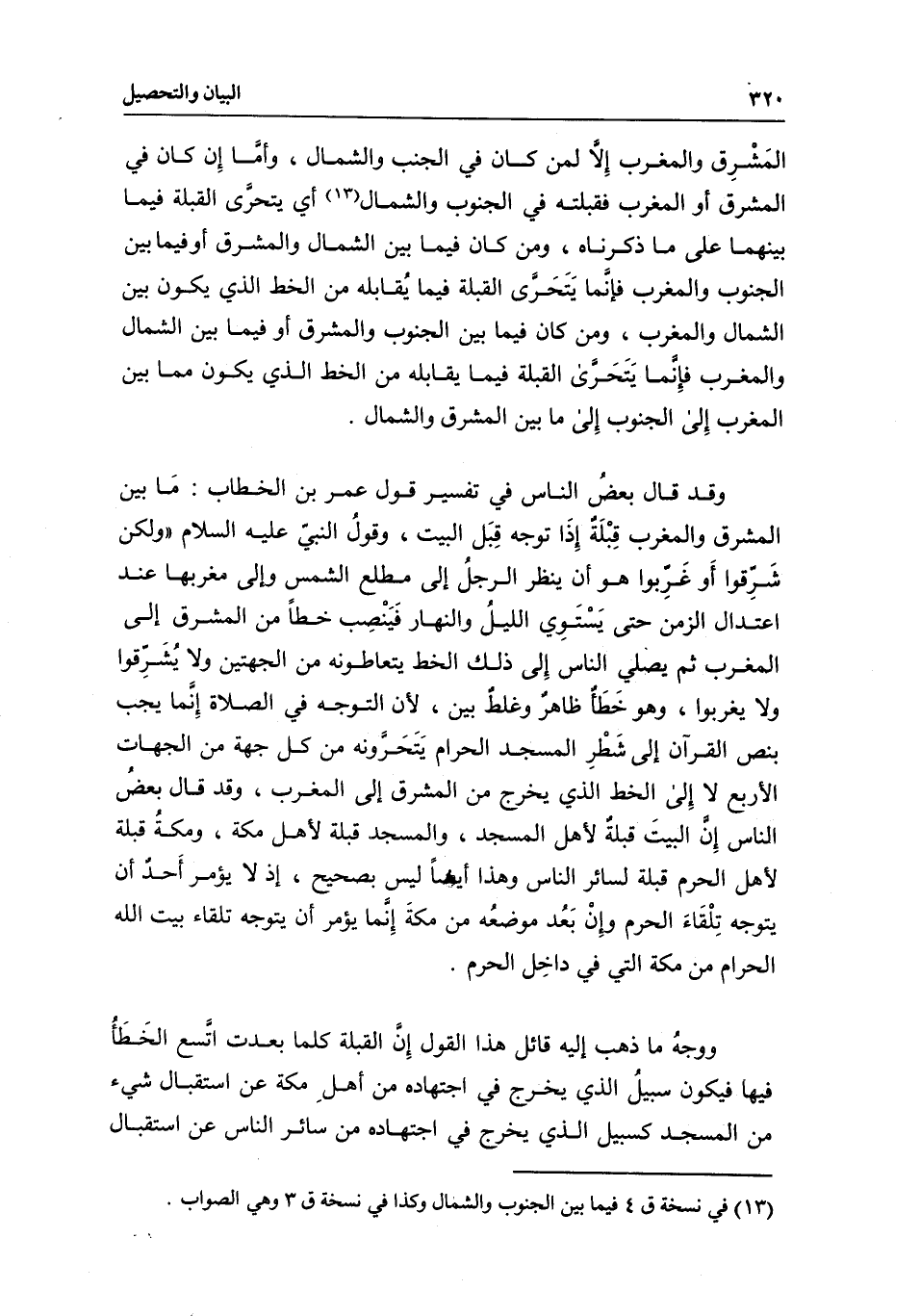 المشرق والمغرب، إلا لمن كان في الجنب والشمال، وأما إن كان في المشرق أو المغرب فقبلته في الجنوب والشمال، أي يتحرى القبلة فيما بينهما على ما ذكرناه، ومن كان فيما بين الشمال والمشرق أو فيما بين الجنوب والمغرب فإنما يتحرى القبلة فيما يقابله من الخط الذي يكون بين الشمال والمغرب، ومن كان فيما بين الجنوب والمشرق أو فيما بين الشمال والمغرب فإنما يتحرى القبلة فيما يقابله من الخط الذي يكون مما بين المغرب إلى الجنوب إلى ما بين المشرق والشمال.