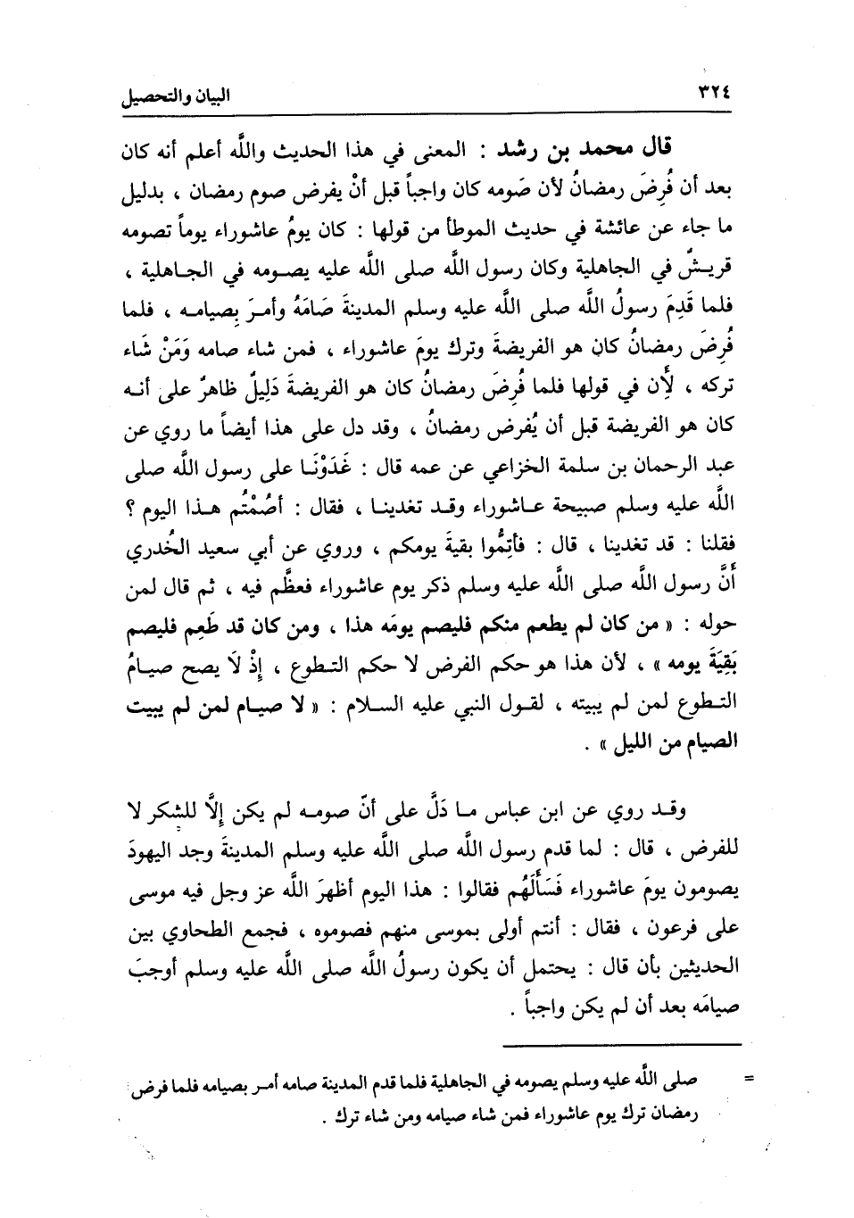 قال محمد بن رشد: المعنى في هذا الحديث - والله أعلم - أنه كان بعد أن فرض رمضان لأن صومه كان واجبا قبل أن يفرض صوم رمضان، بدليل ما جاء عن عائشة في حديث الموطأ من قولها: «كان يوم عاشوراء يوما تصومه قريش في الجاهلية وكان رسول الله صَلَّى اللَّهُ عَلَيْهِ يصومه في الجاهلية، فلما قدم رسول الله - صَلَّى اللَّهُ عَلَيْهِ وَسَلَّمَ - المدينة صامه وأمر بصيامه، فلما فرض رمضان كان هو الفريضة وترك يوم عاشوراء، فمن شاء صامه ومن شاء تركه؛» لأن في قولها فلما فرض رمضان كان هو الفريضة دليل ظاهر على أنه كان هو الفريضة قبل أن يفرض رمضان، وقد دل على هذا أيضا ما روي «عن عبد الرحمن بن سلمة الخزاعي عن عمه قال: غدونا على رسول الله - صَلَّى اللَّهُ عَلَيْهِ وَسَلَّمَ - صبيحة عاشوراء وقد تغدينا، فقال: أصمتم هذا اليوم؟ فقلنا: قد تغدينا، قال: فأتموا بقية يومكم» وروي «عن أبي سعيد الخدري أن رسول الله - صَلَّى اللَّهُ عَلَيْهِ وَسَلَّمَ - ذكر يوم عاشوراء فعظم فيه، ثم قال لمن حوله: " من كان لم يطعم منكم فليصم يومه هذا، ومن كان قد طعم فليصم بقية يومه» ؛ لأن هذا هو حكم الفرض لا حكم التطوع، إذ لا يصح صيام التطوع لمن لم يبيته، لقول النبي - عَلَيْهِ السَّلَامُ -: «لا صيام لمن لم يبيت الصيام من الليل» .