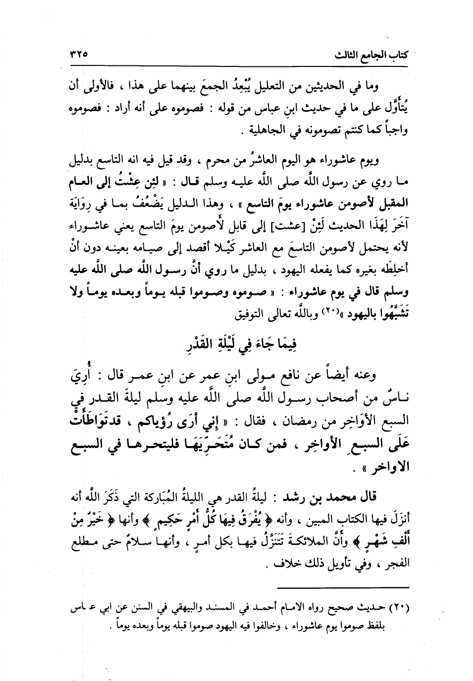 ويوم عاشوراء هو اليوم العاشر من محرم، وقد قيل فيه: إنه التاسع بدليل ما روي عن رسول الله - صَلَّى اللَّهُ عَلَيْهِ وَسَلَّمَ - قال: «لئن عشت إلى العام المقبل لأصومن عاشوراء يوم التاسع» ، وهذا الدليل يضعف بما في رواية آخر لهذا الحديث «لئن أعشت، إلى قابل لأصومن يوم التاسع» يعني عاشوراء لأنه يحتمل لأصومن التاسع مع العاشر كيلا أقصد إلى صيامه بعينه دون أن أخلطه بغيره كما يفعله اليهود، بدليل ما روي أن رسول الله - صَلَّى اللَّهُ عَلَيْهِ وَسَلَّمَ - قال في يوم عاشوراء: «صوموه وصوموا قبله يوما وبعده يوما ولا تشبهوا باليهود» ، وبالله تعالى التوفيق