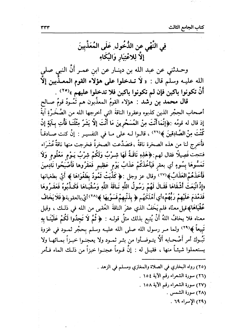 قال محمد بن رشد: هؤلاء القوم المعذبون هم ثمود قوم صالح أصحاب الحجر الذين كذبوه وعقروا الناقة التي أخرجها الله من- الصخرة آية إذ قال له قومه: {إِنَّمَا أَنْتَ مِنَ الْمُسَحَّرِينَ} [الشعراء: 153] {مَا أَنْتَ إِلا بَشَرٌ مِثْلُنَا فَأْتِ بِآيَةٍ إِنْ كُنْتَ مِنَ الصَّادِقِينَ} [الشعراء: 154] ، قالوا له على ما في التفسير: إن كنت صادقا فأخرج لنا من هذه الصخرة ناقة، فتصدعت الصخرة فخرجت منها ناقة عشراء فنتجت فصيلا فقال لهم: {هَذِهِ نَاقَةٌ لَهَا شِرْبٌ وَلَكُمْ شِرْبُ يَوْمٍ مَعْلُومٍ} [الشعراء: 155] {وَلا تَمَسُّوهَا بِسُوءٍ} [الشعراء: 156] أي بعقر {فَيَأْخُذَكُمْ عَذَابُ يَوْمٍ عَظِيمٍ} [الشعراء: 156] {فَعَقَرُوهَا فَأَصْبَحُوا نَادِمِينَ} [الشعراء: 157] {فَأَخَذَهُمُ الْعَذَابُ} [الشعراء: 158] وقال عز وجل: {كَذَّبَتْ ثَمُودُ بِطَغْوَاهَا} [الشمس: 11] أي بطغيانها {إِذِ انْبَعَثَ أَشْقَاهَا} [الشمس: 12] {فَقَالَ لَهُمْ رَسُولُ اللَّهِ نَاقَةَ اللَّهِ وَسُقْيَاهَا} [الشمس: 13] {فَكَذَّبُوهُ فَعَقَرُوهَا فَدَمْدَمَ عَلَيْهِمْ رَبُّهُمْ} [الشمس: 14] أي أهلكهم {بِذَنْبِهِمْ فَسَوَّاهَا} [الشمس: 14] أي بالعقوبة {وَلا يَخَافُ عُقْبَاهَا} [الشمس: 15] قيل معناه فلم يخف الذي عقر الناقة العقبى من الله في ذلك، وقيل معناه فلا يخاف الله أن يتبع بذلك مثل قوله: {ثُمَّ لا تَجِدُوا لَكُمْ عَلَيْنَا بِهِ تَبِيعًا} [الإسراء: 69] ولما مر رسول الله - صَلَّى اللَّهُ عَلَيْهِ وَسَلَّمَ - بحجر ثمود في غزوة تبوك أمر أصحابه ألا يتوضئوا من بئر ثمود ولا يعجنوا خبزا بمائها ولا يستعملوا شيئا منها، فقيل له: إن قوما عجنوا خبزا من ذلك الماء فأمر