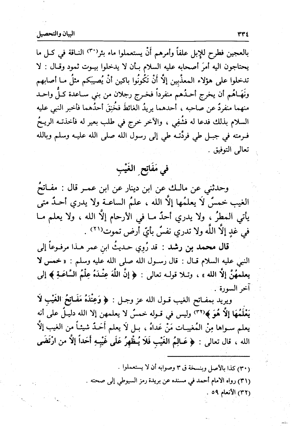 قال محمد بن رشد: قد روي حديث ابن عمر هذا مرفوعا إلى النبي - عَلَيْهِ السَّلَامُ - قال. قال رسول الله - صَلَّى اللَّهُ عَلَيْهِ وَسَلَّمَ -: «خمس لا يعلمهن إلا الله "، وتلا قوله تعالى: {إِنَّ اللَّهَ عِنْدَهُ عِلْمُ السَّاعَةِ} [لقمان: 34] إلى آخر السورة» .