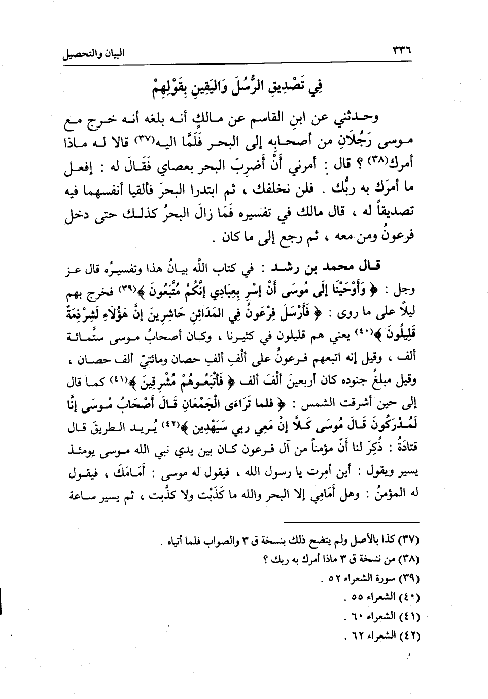 قال محمد بن رشد: في كتاب الله بيان هذا، وتفسيره قال عز وجل: {وَأَوْحَيْنَا إِلَى مُوسَى أَنْ أَسْرِ بِعِبَادِي إِنَّكُمْ مُتَّبَعُونَ} [الشعراء: 52] فخرج بهم ليلا على ما روى: {فَأَرْسَلَ فِرْعَوْنُ فِي الْمَدَائِنِ حَاشِرِينَ} [الشعراء: 53] {إِنَّ هَؤُلاءِ لَشِرْذِمَةٌ قَلِيلُونَ} [الشعراء: 54] يعني هم قليلون في كثيرنا، وكان أصحاب موسى ستمائة ألف، وقيل إنه اتبعهم فرعون على ألف ألف حصان ومائتي ألف حصان، وقيل مبلغ جنوده كان أربعين ألف ألف {فَأَتْبَعُوهُمْ مُشْرِقِينَ} [الشعراء: 60] كما قال إلى حين أشرقت الشمس: {فَلَمَّا تَرَاءَى الْجَمْعَانِ قَالَ أَصْحَابُ مُوسَى إِنَّا لَمُدْرَكُونَ} [الشعراء: 61] {قَالَ كَلا إِنَّ مَعِيَ رَبِّي سَيَهْدِينِ} [الشعراء: 62] يريد الطريق، قال قتادة: ذكر لنا أن مؤمنا من آل فرعون كان بين يدي نبي الله موسى يومئذ يسير ويقول: أين أمرت يا رسول الله، فيقول له موسى: أمامك، فيقول له المؤمن: وهل أمامي إلا البحر، والله ما كذبت ولا كذبت، ثم يسير ساعة