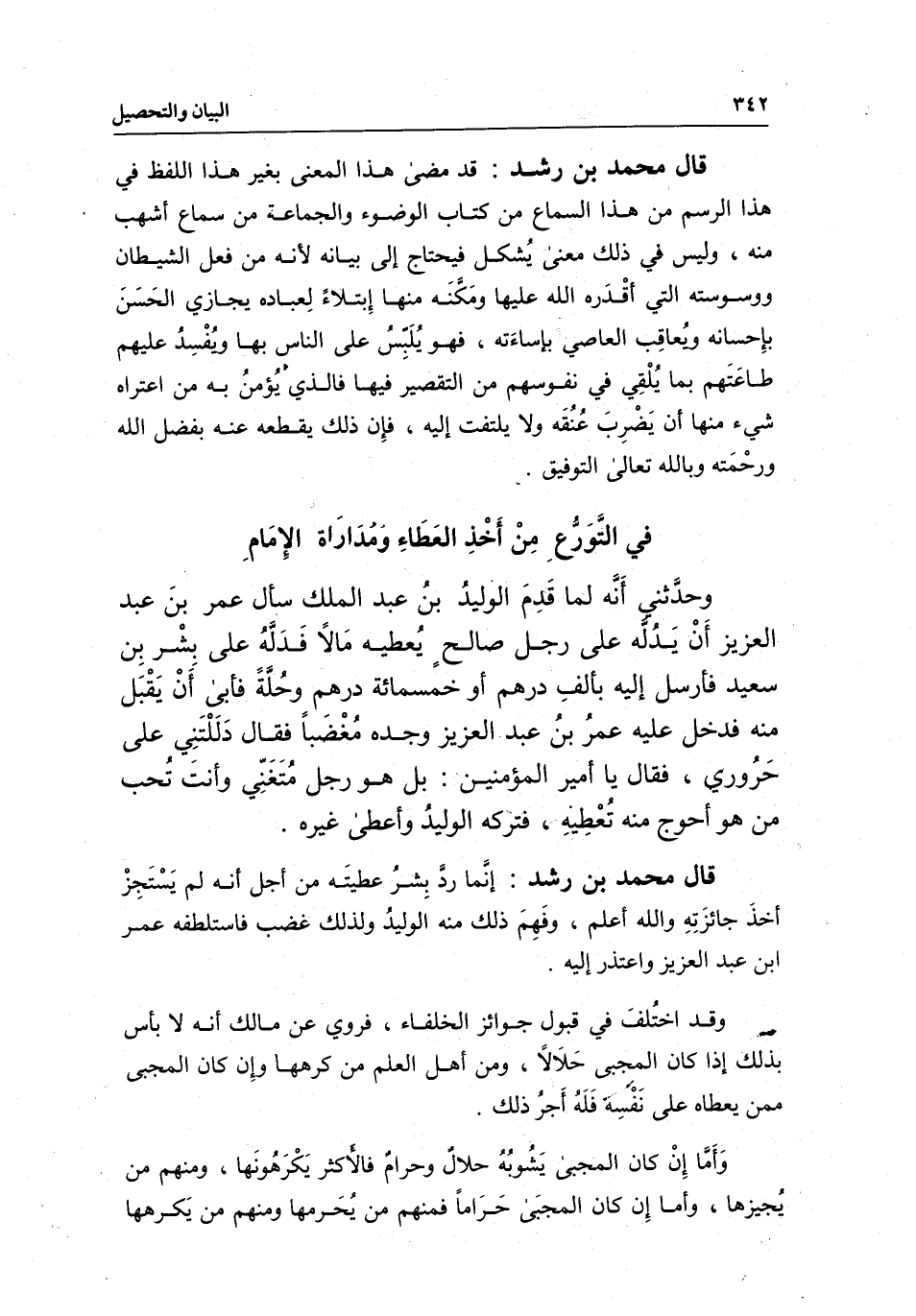 قال محمد بن رشد: إنما رد بشر عطيته من أجل أنه لم يستجز أخذ جائزته، والله أعلم، وفهم ذلك منه الوليد، ولذلك غضب، فاستلطفه عمر بن عبد العزيز واعتذر إليه.