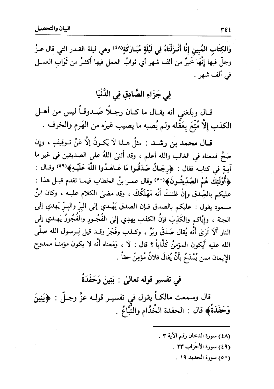 في جزاء الصادق في الدنيا قال: وبلغني أنه يقال ما كان رجلا صدوقا ليس من أهل الكذب إلا متع بعقله ولم يصبه ما يصيب غيره من الهرم والخرف. قال محمد بن رشد: مثل هذا لا يكون إلا عن توقيف، وإن صح فمعناه في الغالب، والله أعلم، وقد أثنى الله على الصديقين في غير ما آية في كتابه فقال: {رِجَالٌ صَدَقُوا مَا عَاهَدُوا اللَّهَ عَلَيْهِ} [الأحزاب: 23] وقال: {أُولَئِكَ هُمُ الصِّدِّيقُونَ} [الحديد: 19] وقال عمر بن الخطاب فيما تقدم قبل هذا: عليكم بالصدق وإن ظننت أنه مهلكك، وقد مضى الكلام عليه، وكان ابن مسعود يقول: «عليكم بالصدق فإن الصدق يهدي إلى البر، والبر يهدي إلى الجنة، وإياكم والكذب، فإن الكذب يهدي إلى الفجور، والفجور يهدي إلى النار» ألا ترى أنه يقال صدق وبر، وكذب وفجر، وقد «قيل لرسول الله صَلَّى اللَّهُ عَلَيْهِ: أيكون المؤمن كذابا؟ قال: لا» ومعناه أنه لا يكون مؤمنا ممدوح الإيمان ممن يمدح بأن يقال فلان مؤمن حقا.