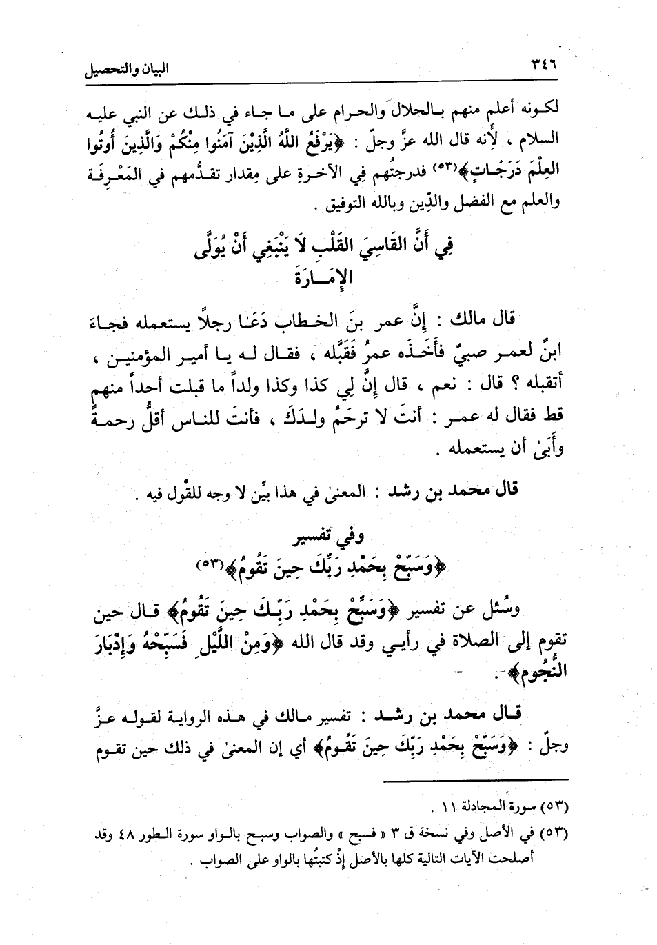 قال محمد بن رشد: تفسير مالك في هذه الرواية لقوله عز وجل: {وَسَبِّحْ بِحَمْدِ رَبِّكَ حِينَ تَقُومُ} [الطور: 48] أي إن المعنى في ذلك حين تقوم