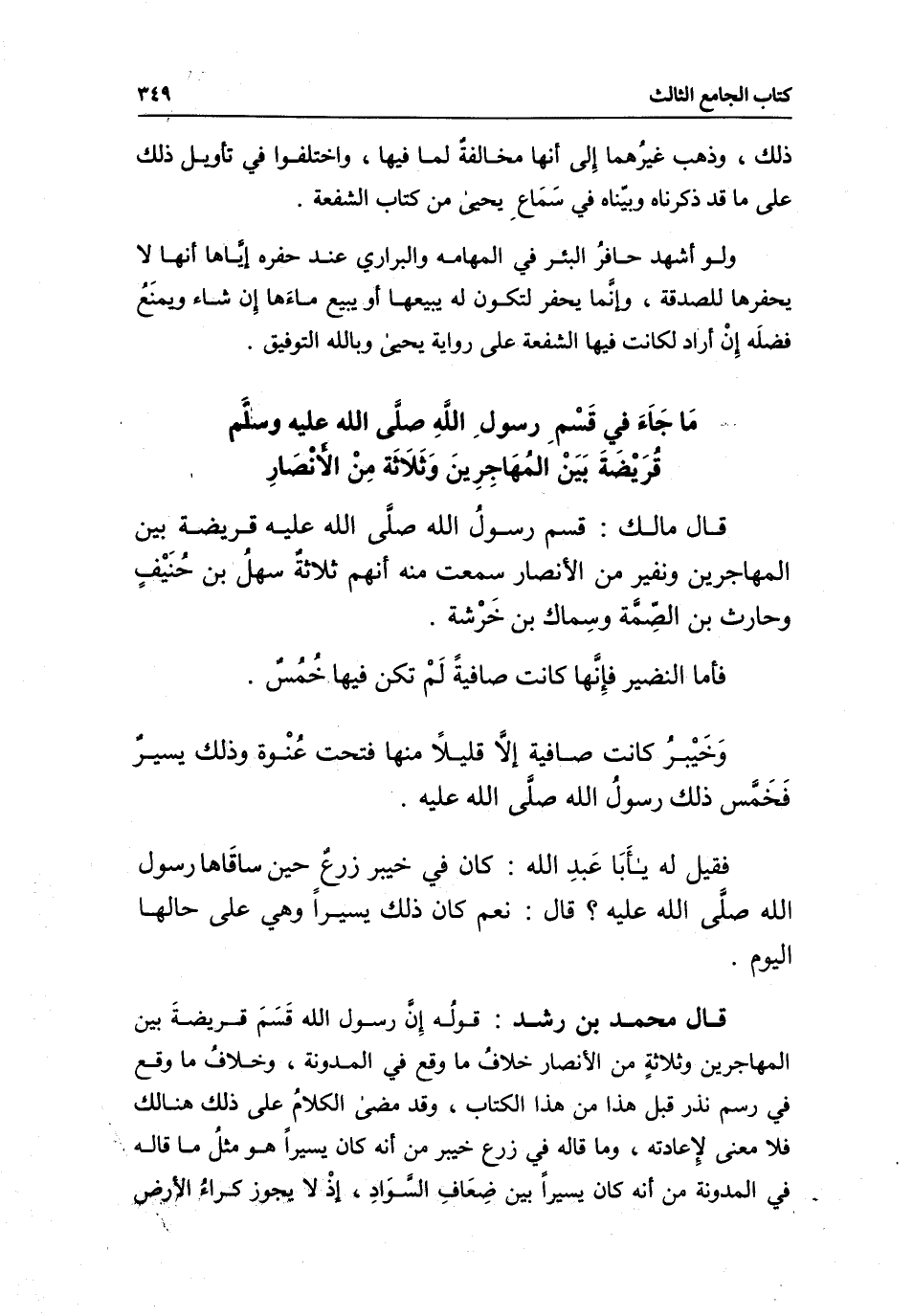 قريضة بين المهاجرين وثلاثة من الأنصار قال مالك: قسم رسول الله صَلَّى اللَّهُ عَلَيْهِ قريضة بين المهاجرين ونفير من الأنصار، سمعت منه أنهم ثلاثة: سهل بن حنيف، وحارث بن الصمة، وسماك بن خرشة.