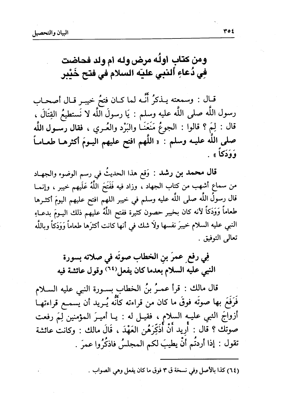 قال محمد بن رشد: وقع هذا الحديث في رسم الوضوء والجهاد من سماع أشهب من كتاب الجهاد، وزاد فيه ففتح الله عليهم خيبر، وإنما قال رسول الله - صَلَّى اللَّهُ عَلَيْهِ وَسَلَّمَ - في خيبر: «اللهم افتح عليهم اليوم أكثرها طعاما وودكا؛» لأنه كان بخيبر حصون كثيرة ففتح الله عليهم ذلك اليوم بدعاء النبي - عَلَيْهِ السَّلَامُ - خيبر نفسها، ولا شك في أنها كانت أكثرها طعاما وودكا، وبالله تعالى التوفيق.