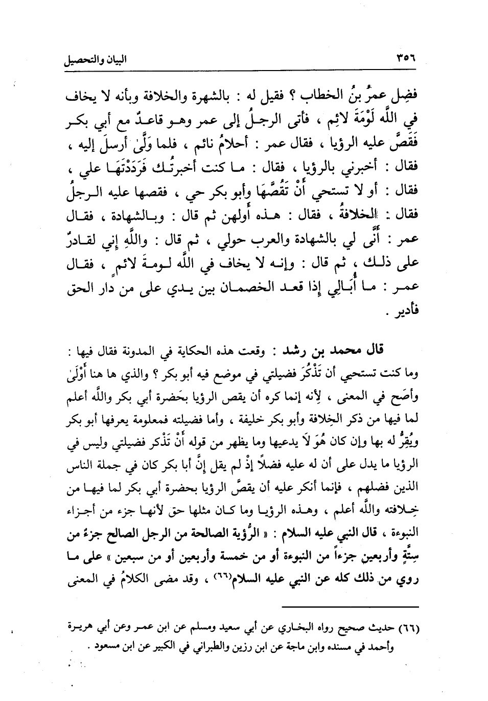 قال محمد بن رشد: وقعت هذه الحكاية في المدونة فقال فيها: وما كنت تستحيي أن تذكر فضيلتي في موضع فيه أبو بكر؟ والذي ها هنا أولى وأصح في المعنى؛ لأنه إنما كره أن يقص الرؤيا بحضرة أبي بكر والله أعلم، لما فيها من ذكر الخلافة وأبو بكر خليفة، وأما فضيلته فمعلومة يعرفها أبو بكر ويقر له بها، وإن كان هو لا يدعيها، وما يظهر من قوله أن تذكر فضيلتي، وليس في الرؤيا ما يدل على أن له عليه فضلا، إذ لم يقل إن أبا بكر كان في جملة الناس الذين فضلهم، فإنما أنكر عليه أن يقص الرؤيا بحضرة أبى بكر لما فيها من خلافته، والله أعلم، وهذه الرؤيا وما كان مثلها حق؛ لأنها جزء من أجزاء النبوءة، قال النبي - عَلَيْهِ السَّلَامُ -: «الرؤية الصالحة من الرجل الصالح جزء من ستة وأربعين جزءا من النبوءة، أو من خمسة وأربعين، أو من سبعين» على ما روي من ذلك كله عن النبي - عَلَيْهِ السَّلَامُ -، وقد مضى الكلام في المعنى
