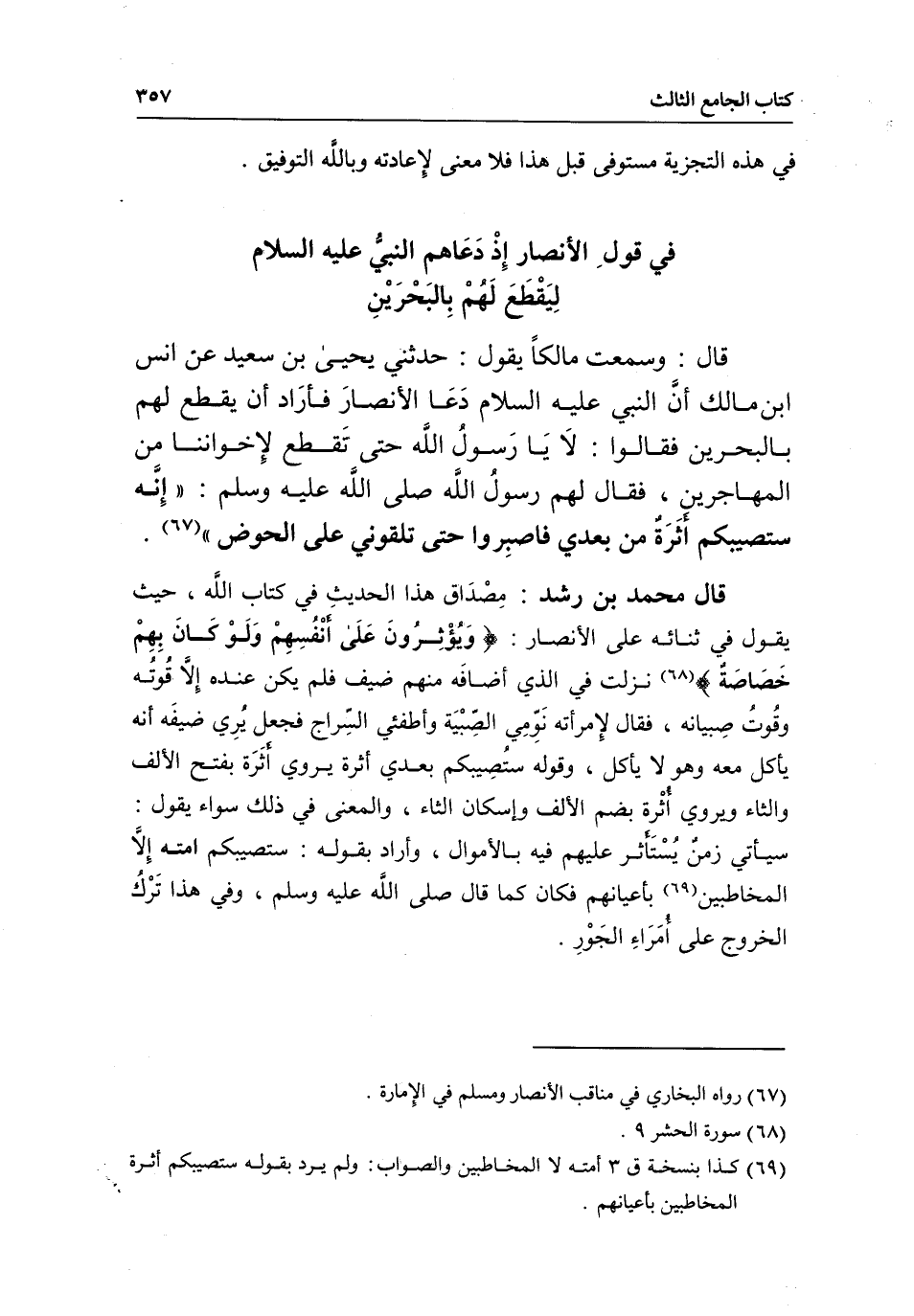 ليقطع لهم بالبحرين قال: وسمعت مالكا يقول: حدثني يحيى بن سعيد، عن انس بن مالك، «أن النبي - عَلَيْهِ السَّلَامُ - دعا الأنصار فأراد أن يقطع لهم بالبحرين فقالوا: لا يا رسول الله حتى تقطع لإخواننا من المهاجرين، فقال لهم رسول الله - صَلَّى اللَّهُ عَلَيْهِ وَسَلَّمَ -: " إنه ستصيبكم أثرة من بعدي، فاصبروا حتى تلقوني على الحوض» .
