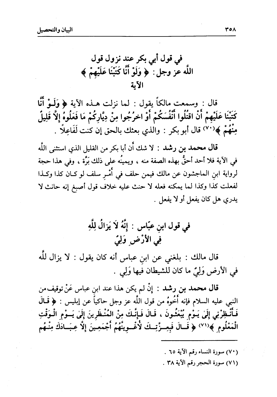 قال محمد بن رشد: إن لم يكن هذا عند ابن عباس عن توقيف من النبي - عَلَيْهِ السَّلَامُ - فإنه أخذه من قول الله عز وجل حاكيا عن إبليس: {قَالَ رَبِّ فَأَنْظِرْنِي إِلَى يَوْمِ يُبْعَثُونَ} [ص: 79] {قَالَ فَإِنَّكَ مِنَ الْمُنْظَرِينَ} [ص: 80] {إِلَى يَوْمِ الْوَقْتِ الْمَعْلُومِ} [ص: 81] {قَالَ فَبِعِزَّتِكَ لأُغْوِيَنَّهُمْ أَجْمَعِينَ} [ص: 82] {إِلا عِبَادَكَ مِنْهُمُ الْمُخْلَصِينَ} [ص: 83]