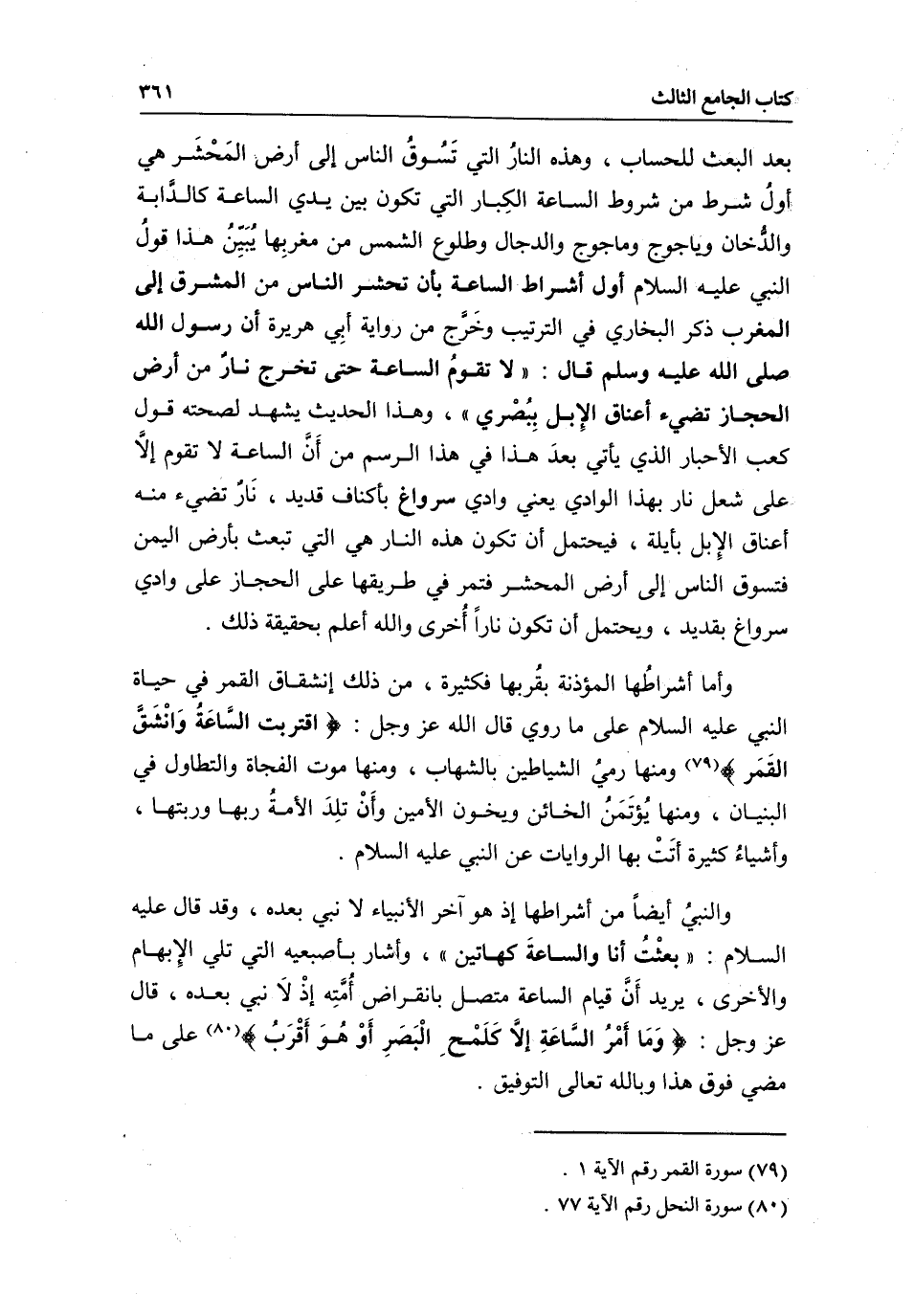 بعد البعث للحساب، وهذه النار التي تسوق الناس إلى أرض المحشر هي أول شرط من شروط الساعة الكبار التي تكون بين يدي الساعة كالدابة والدخان وياجوج وماجوج والدجال، وطلوع الشمس من مغربها، يبين هذا قول النبي - عَلَيْهِ السَّلَامُ - أول أشراط الساعة بأن تحشر الناس من المشرق إلى المغرب، ذكر البخاري في الترتيب، وخرج من رواية أبي هريرة أن رسول الله - صَلَّى اللَّهُ عَلَيْهِ وَسَلَّمَ - قال: «لا تقوم الساعة حتى تخرج نار من أرض الحجاز تضيء أعناق الإبل ببصرى» ، وهذا الحديث يشهد لصحته قول كعب الأحبار الذي يأتي بعد هذا في هذا الرسم من أن الساعة لا تقوم إلا على شعل نار بهذا الوادي، يعني وادي سرواغ بأكناف قديد، نار تضيء منه أعناق الإبل بأيلة، فيحتمل أن تكون هذه النار هي التي تبعث بأرض اليمن فتسوق الناس إلى أرض المحشر فتمر في طريقها على الحجاز على وادي سرواغ بقديد، ويحتمل أن تكون نارا أخرى، والله أعلم بحقيقة ذلك.
