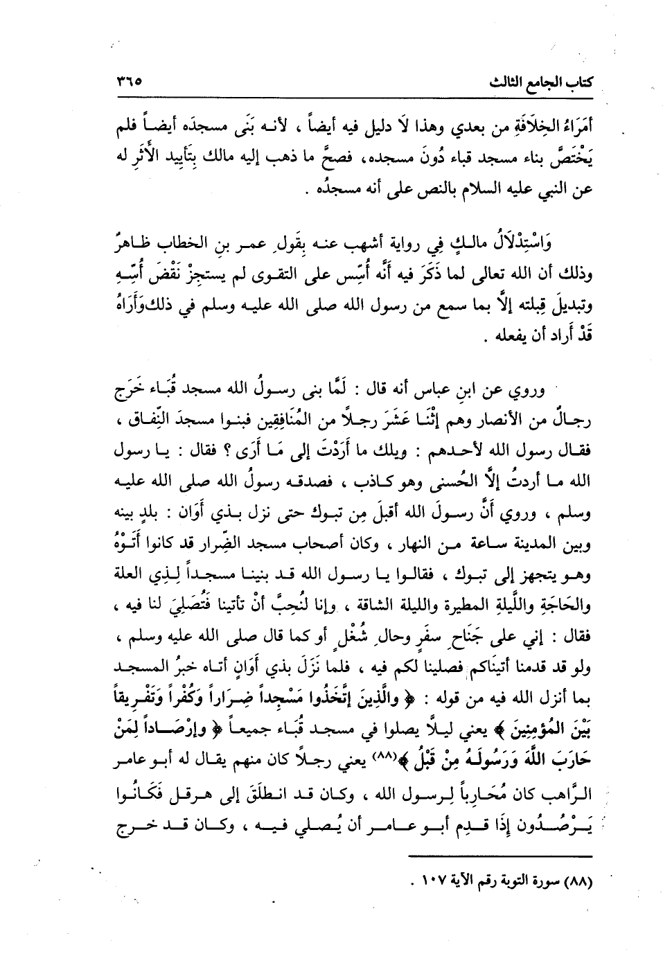 واستدلال مالك في رواية أشهب عنه بقول عمر بن الخطاب ظاهر، وذلك أن الله تعالى لما ذكر فيه أنه أسس على التقوى لم يستجز نقض أسه وتبديل قبلته إلا بما سمع من رسول الله - صَلَّى اللَّهُ عَلَيْهِ وَسَلَّمَ - في ذلك وأراه قد أراد أن يفعله.