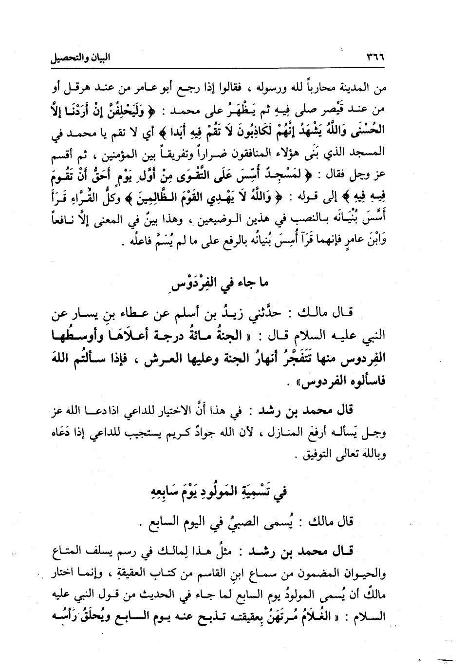 قال محمد بن رشد: مثل هذا لمالك في رسم يسلف المتاع والحيوان المضمون من سماع ابن القاسم من كتاب العقيقة، وإنما اختار مالك أن يسمى المولود يوم السابع لما جاء في الحديث من قول النبي - عَلَيْهِ السَّلَامُ -: «الغلام مرتهن بعقيقته، تذبح عنه يوم السابع، ويحلق رأسه