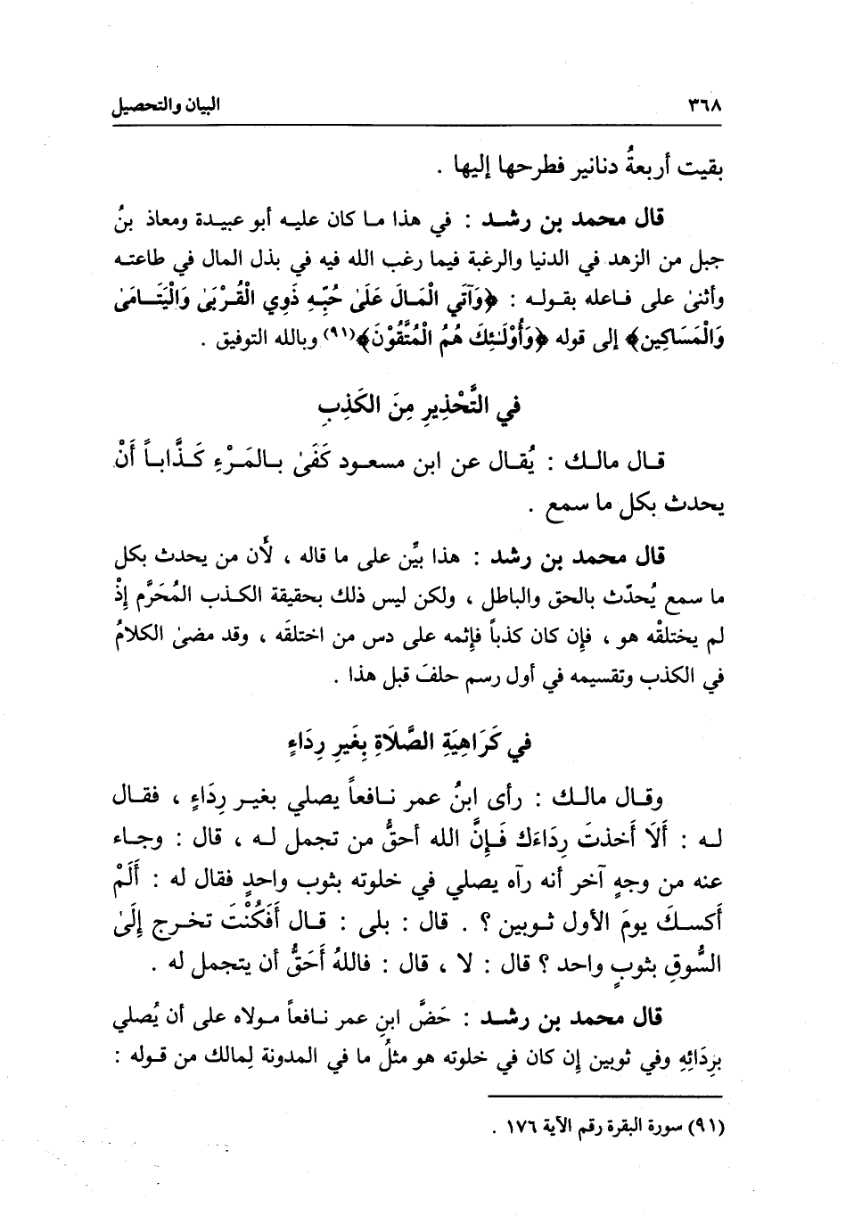 قال محمد بن رشد: في هذا ما كان عليه أبو عبيدة ومعاذ بن جبل من الزهد في الدنيا والرغبة فيما رغب الله فيه في بذل المال في طاعته وأثنى على فاعله بقوله: {وَآتَى الْمَالَ عَلَى حُبِّهِ ذَوِي الْقُرْبَى وَالْيَتَامَى وَالْمَسَاكِينَ} [البقرة: 177] إلى قوله: {وَأُولَئِكَ هُمُ الْمُتَّقُونَ} [البقرة: 177] ، وبالله التوفيق.