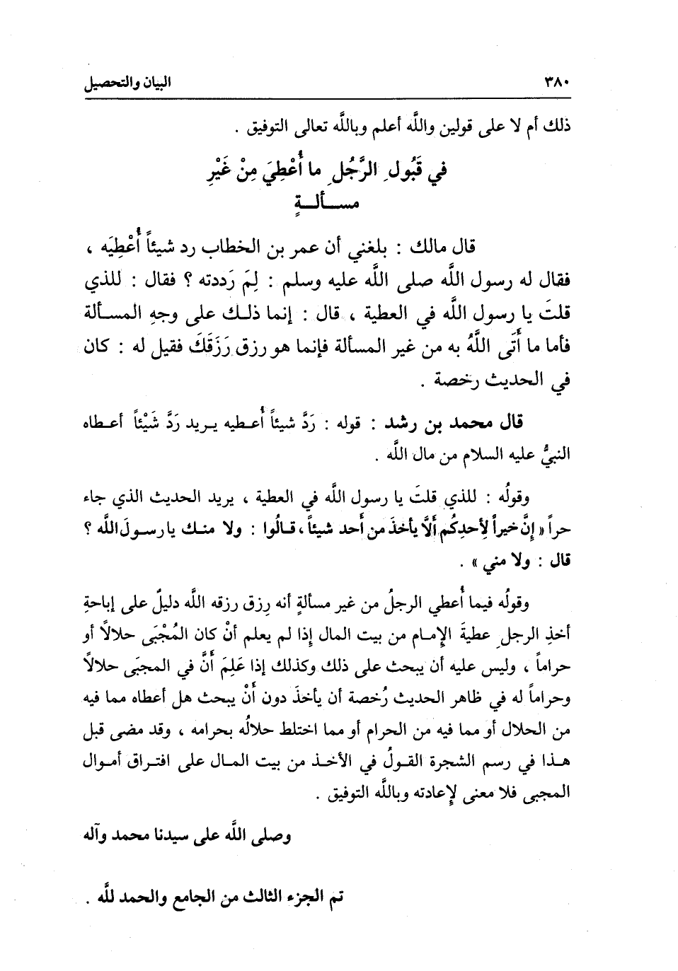 مسألة قال مالك: بلغني «أن عمر بن الخطاب رد شيئا أعطيه، فقال له رسول الله - صَلَّى اللَّهُ عَلَيْهِ وَسَلَّمَ -: لم رددته؟ فقال: للذي قلت يا رسول الله في العطية، قال: إنما ذلك على وجه المسألة، فأما ما أتى الله به من غير المسألة فإنما هو رزق رزقك» إقيل له: كان في الحديث رخصة.