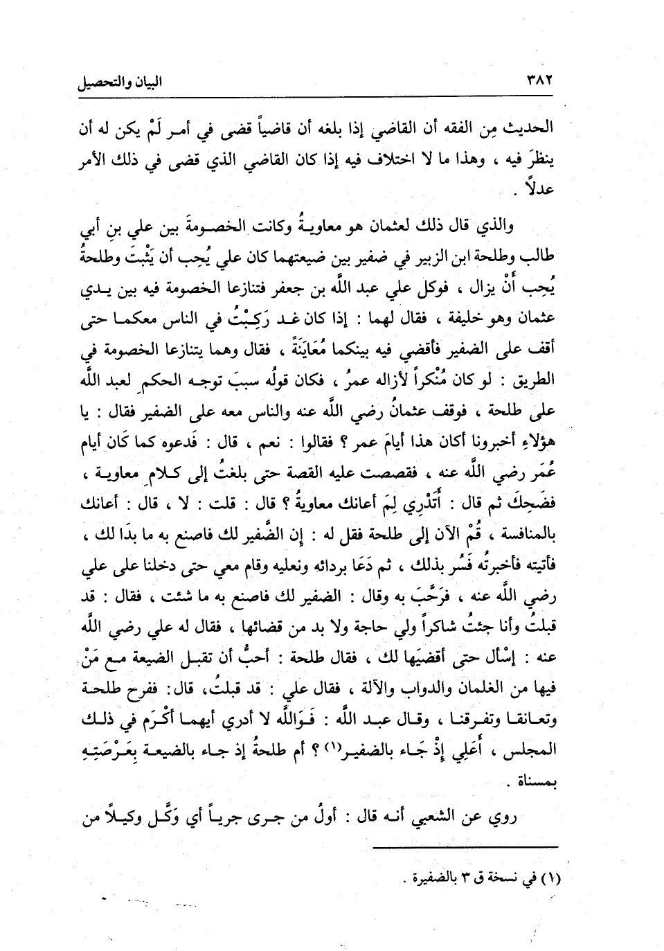 والذي قال ذلك لعثمان هو معاوية، وكانت الخصومة بين علي بن أبي طالب وطلحة ابن الزبير في ضفير بين ضيعتهما كان علي يحب أن يثبت وطلحة يحب أن يزال، فوكل علي عبد الله بن جعفر فتنازعا الخصومة فيه بين يدي عثمان وهو خليفة، فقال لهما: إذا كان غد ركبت في الناس معكما حتى أقف على الضفير فأقضي فيه بينكما معاينة، فقال وهما يتنازعا الخصومة في الطريق: لو كان منكرا لأزاله عمر، فكان قوله سبب توجه الحكم لعبد الله على طلحة، فوقف عثمان - رَضِيَ اللَّهُ عَنْهُ - والناس معه على الضفير فقال: يا هؤلاء أخبرونا أكان هذا أيام عمر؟ فقالوا: نعم، قال: فدعوه كما كان أيام عمر - رَضِيَ اللَّهُ عَنْهُ -، فقصصت عليه القصة حتى بلغت إلى كلام معاوية، فضحك ثم قال: أتدري لم أعانك معاوية؟ قال: قلت: لا، قال: أعانك بالمنافسة، قم الآن إلى طلحة فقل له: إن الضفير لك فاصنع به ما بدا لك، فأتيته فأخبرته فسر بذلك، ثم دعا بردائه ونعليه وقام معي حتى دخلنا على علي - رَضِيَ اللَّهُ عَنْهُ -، فرحب به وقال: الضفير لك فاصنع به ما شئت، فقال: قد قبلت وأنا جئت شاكرا ولي حاجة ولا بد من قضائها، فقال له علي - رَضِيَ اللَّهُ عَنْهُ -: اسأل حتى أقضيها لك، فقال طلحة: أحب أن تقبل الضيعة مع من فيها من الغلمان والدواب والآلة، فقال علي: قد قبلت، قال: ففرح طلحة وتعانقا وتفرقنا، وقال عبد الله: فوالله لا أدري أيهما أكرم في ذلك المجلس، أعلي إذ جاء بالضفير؟ أم طلحة إذ جاء بالضيعة بعرصته بمسناة.