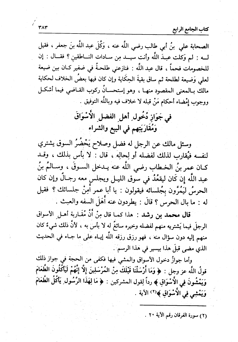 وأما جواز دخول الأسواق والمشي فيها فكفى من الحجة في جواز ذلك قول الله عز وجل: {وَمَا أَرْسَلْنَا قَبْلَكَ مِنَ الْمُرْسَلِينَ إِلا إِنَّهُمْ لَيَأْكُلُونَ الطَّعَامَ وَيَمْشُونَ فِي الأَسْوَاقِ} [الفرقان: 20] ردا لقول المشركين: {مَالِ هَذَا الرَّسُولِ يَأْكُلُ الطَّعَامَ وَيَمْشِي فِي الأَسْوَاقِ} [الفرقان: 7] الآية.