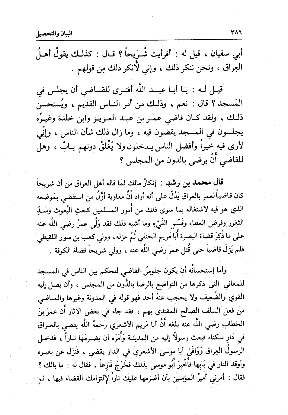 قال محمد بن رشد: إنكار مالك لما قاله أهل العراق من أن شريحا كان قاضيا لعمر بالعراق يدل على أنه أراد أن معاوية أول من استقضي بموضعه الذي هو فيه لاشتغاله بما سوى ذلك من أمور المسلمين كبعث البعوث وسد الثغور وفرض العطاء وقسم الفيء وما أشبه ذلك، فقد ولى عمر - رَضِيَ اللَّهُ عَنْهُ - على ما ذكر قضاء البصرة أبا مريم الحنفي ثم عزله، وولي كعب بن سور اللقيطي فلم يزل قاضيا حتى قتل عمر - رَضِيَ اللَّهُ عَنْهُ -، وولي شريحا قضاء الكوفة.