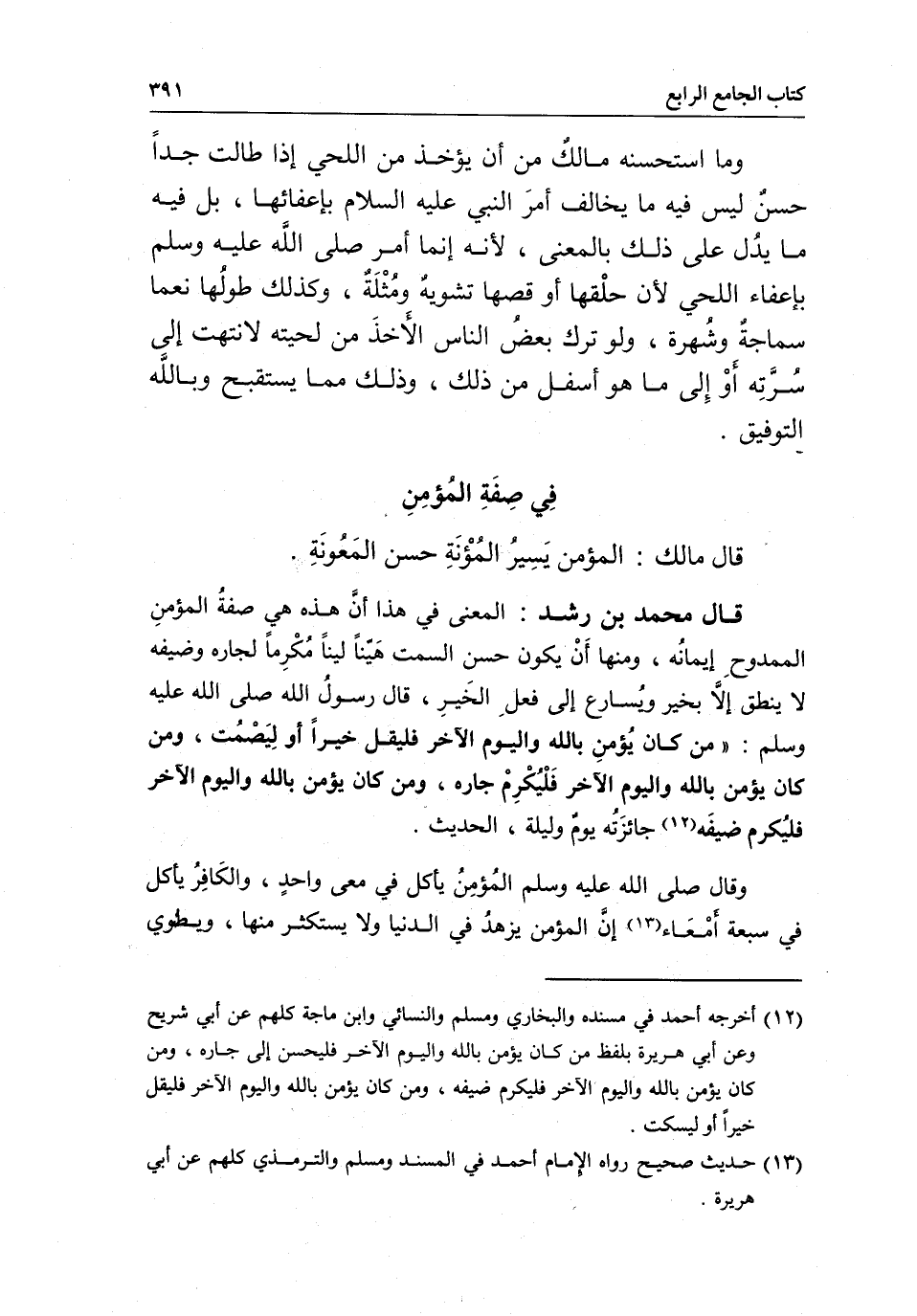 قال محمد بن رشد: المعنى في هذا أن هذه هي صفة المؤمن الممدوح إيمانه، ومنها أن يكون حسن السمت هينا لينا مكرما لجاره وضيفه لا ينطق إلا بخير ويسارع إلى فعل الخير، قال رسول الله - صَلَّى اللَّهُ عَلَيْهِ وَسَلَّمَ -: «من كان يؤمن بالله واليوم الآخر فليقل خيرا أو ليصمت، ومن كان يؤمن بالله واليوم الآخر فليكرم جاره، ومن كان يؤمن بالله واليوم الآخر فليكرم ضيفه" جائزته يوم وليلة» الحديث.