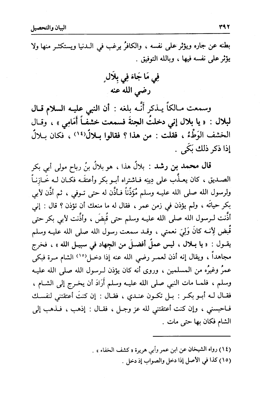 قال محمد بن رشد: بلال هذا هو بلال بن رباح مولى أبي بكر الصديق، كان يعذب على دينه، فاشتراه أبو بكر وأعتقه، فكان له خازنا ولرسول الله - صَلَّى اللَّهُ عَلَيْهِ وَسَلَّمَ - مؤذنا، فأذن له حتى توفي، ثم أذن لأبي بكر حياته، ولم يؤذن في زمن عمر، فقال له: ما منعك أن تؤذن؟ قال: إني أذنت لرسول الله - صَلَّى اللَّهُ عَلَيْهِ وَسَلَّمَ - حتى قبض، وأذنت لأبي بكر حتى قبض؛ لأنه كان ولي نعمتي، وقد سمعت رسول الله - صَلَّى اللَّهُ عَلَيْهِ وَسَلَّمَ - يقول: «يا بلال، ليس عمل أفضل من الجهاد في سبيل الله» ، فخرج مجاهدا، ويقال: إنه أذن لعمر - رَضِيَ اللَّهُ عَنْهُ - إذا دخل الشام مرة فبكى عمر وغيره من المسلمين، وروي: أنه كان يؤذن لرسول الله - صَلَّى اللَّهُ عَلَيْهِ وَسَلَّمَ -، فلما مات النبي - صَلَّى اللَّهُ عَلَيْهِ وَسَلَّمَ - أراد أن يخرج إلى الشام، فقال له أبو بكر: بل تكون عندي، فقال: إن كنت أعتقتني لنفسك فاحبسني، وإن كنت أعتقتني لله عز وجل، فقال: اذهب، فذهب إلى الشام، فكان بها حتى مات.