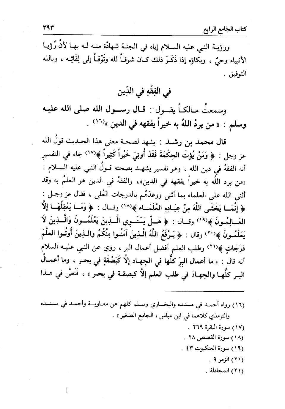 في الفقه في الدين وسمعت مالكا يقول: قال رسول الله - صَلَّى اللَّهُ عَلَيْهِ وَسَلَّمَ -: «من يرد الله به خيرا يفقهه في الدين» .