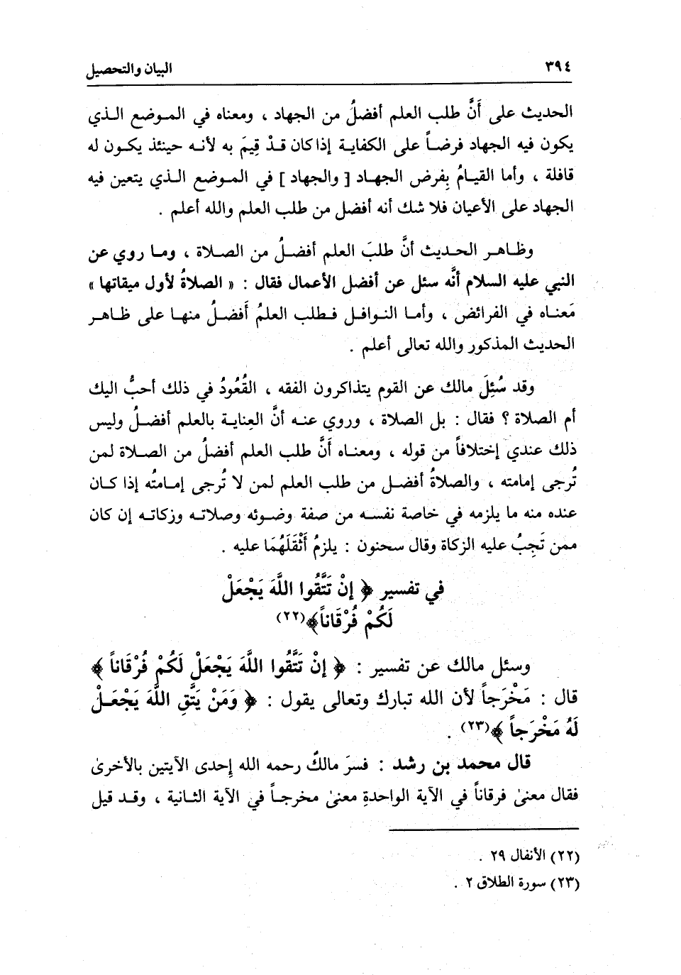 قال محمد بن رشد: فسر مالك - رَحِمَهُ اللَّهُ - إحدى الآيتين بالأخرى، فقال: معنى فرقانا في الآية الواحدة معنى مخرجا في الآية الثانية، وقد قيل: