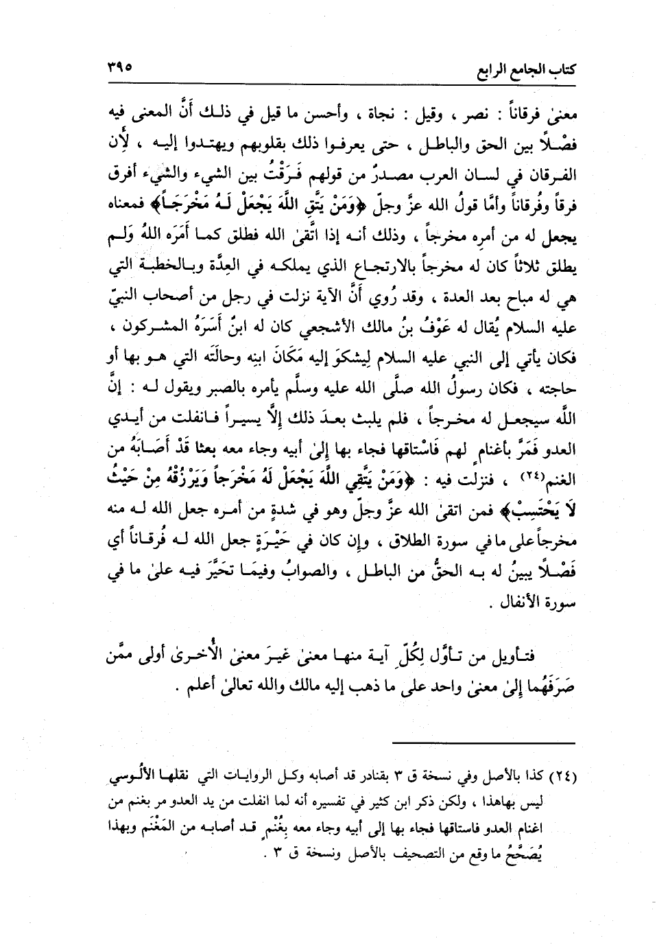 معنى فرقانا: نصر، وقيل: نجاة، وأحسن ما قيل في ذلك أن المعنى فيه فصلا بين الحق والباطل، حتى يعرفوا ذلك بقلوبهم ويهتدوا إليه؛ لأن الفرقان في لسان العرب مصدر من قولهم فرقت بين الشيء والشيء أفرق فرقا وفرقانا. وأما قول الله عز وجل {وَمَنْ يَتَّقِ اللَّهَ يَجْعَلْ لَهُ مَخْرَجًا} [الطلاق: 2] ، فمعناه: يجعل له من أمره مخرجا، وذلك أنه إذا اتقى الله فطلق كما أمره الله ولم يطلق ثلاثا كان له مخرجا بالارتجاع الذي يملكه في العدة وبالخطبة التي هي له مباح بعد العدة، وقد روي: أن الآية نزلت في رجل من أصحاب النبي - عَلَيْهِ السَّلَامُ - يقال له عوف بن مالك الأشجعي كان له ابن أسره المشركون، فكان يأتي إلى النبي - عَلَيْهِ السَّلَامُ - ليشكو إليه مكان ابنه وحالته التي هو بها أو حاجته، فكان رسول الله - صَلَّى اللَّهُ عَلَيْهِ وَسَلَّمَ - يأمره بالصبر، ويقول له: إن الله سيجعل له مخرجا، فلم يلبث بعد ذلك إلا يسيرا فانفلت من أيدي العدو فمر بأغنام لهم فاستاقها فجاء بها إلى أبيه وجاء معه بعثا قد أصابه من الغنم، فنزلت فيه: {وَمَنْ يَتَّقِ اللَّهَ يَجْعَلْ لَهُ مَخْرَجًا} [الطلاق: 2] {وَيَرْزُقْهُ مِنْ حَيْثُ لا يَحْتَسِبُ} [الطلاق: 3] ، فمن اتقى الله عز وجل وهو في شدة من أمره جعل الله له منه مخرجا على ما في سورة الطلاق، وإن كان في حيرة جعل الله له فرقانا، أي: فصلا يبين له به الحق من الباطل، والصواب وفيما تحير فيه على ما في سورة الأنفال.