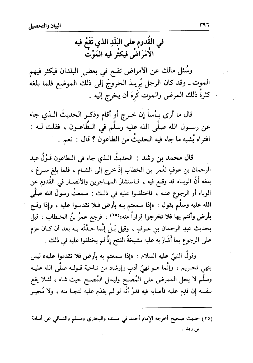 قال محمد بن رشد: الحديث الذي جاء في الطاعون قول عبد الرحمن بن عوف لعمر بن الخطاب إذ خرج إلى الشام، فلما بلغ سرغ، بلغه أن الوباء قد وقع فيه، فاستشار المهاجرين والأنصار في القدوم عن الوباء أو الرجوع عنه، فاختلفوا عليه في ذلك: سمعت رسول الله - صَلَّى اللَّهُ عَلَيْهِ وَسَلَّمَ - يقول: «إذا سمعتم به بأرض فلا تقدموا عليه، وإذا وقع بأرض وأنتم بها فلا تخرجوا فرارا منه» ، فرجع عمر بن الخطاب، قيل: بحديث عبد الرحمن بن عوف، وقيل: بل إنما حدثه به بعد أن كان عزم على الرجوع بما أشار به عليه مشيخة الفتح إذ لم يختلفوا عليه في ذلك.
