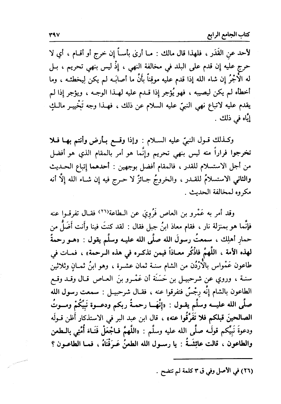 وقد أمر به عمرو بن العاص فروي عن الطاعة، فقال: تفرقوا عنه فإنما هو بمنزلة نار، فقام معاذ بن جبل، فقال: لقد كنت فينا وأنت أضل من حمار أهلك، سمعت رسول الله - صَلَّى اللَّهُ عَلَيْهِ وَسَلَّمَ - يقول: «هو رحمة لهذه الأمة» اللهم فاذكر معاذا فيمن تذكره في هذه الرحمة "، فمات في طاعون عمواس بالأردن من الشام سنة ثماني عشرة، وهو ابن ثمان وثلاثين سنة، وروي عن شرحبيل بن حسنة أن عمرو بن العاص قال وقد وقع الطاعون بالشام: إنه رجس فتفرقوا عنه، فقال شرحبيل: سمعت رسول الله - صَلَّى اللَّهُ عَلَيْهِ وَسَلَّمَ - يقول: «إنها رحمة ربكم ودعوة نبيكم وموت الصالحين قبلكم فلا تفرقوا عنه» . قال ابن عبد البر في الاستذكار أظن قوله " ودعوة نبيكم " قوله - صَلَّى اللَّهُ عَلَيْهِ وَسَلَّمَ -: «اللهم فاجعل فناء أمتي بالطعن والطاعون، قالت عائشة: يا رسول الله، الطعن عرفناه، فما الطاعون؟