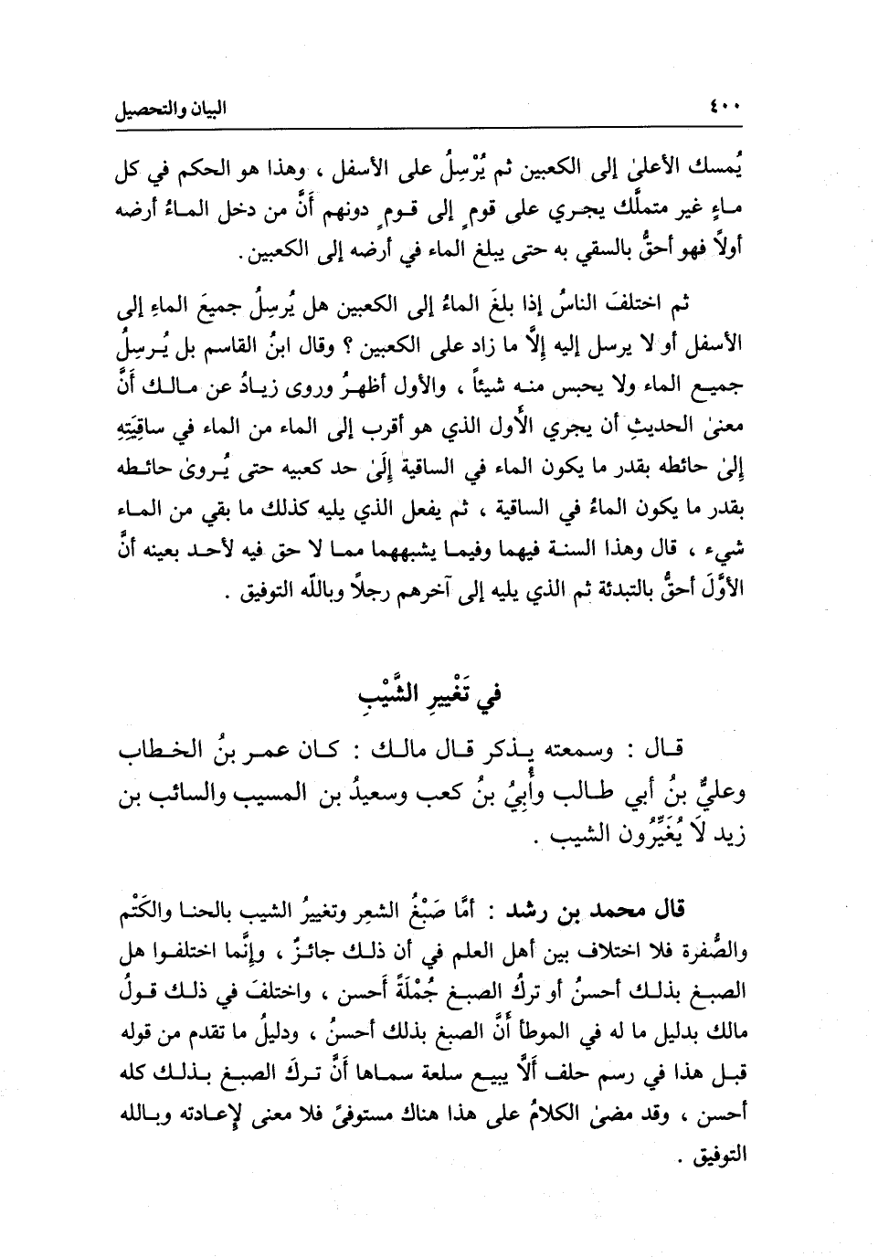 في تغيير الشيب قال: وسمعته يذكر، قال مالك: كان عمر بن الخطاب وعلي بن أبي طالب وأبي بن كعب وسعيد بن المسيب والسائب بن زيد لا يغيرون الشيب.