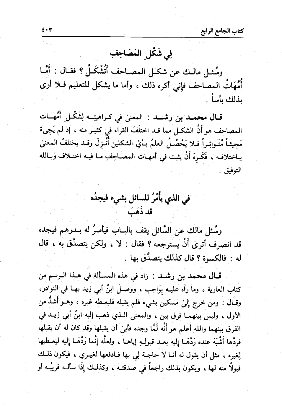 قال محمد بن رشد: المعنى في كراهيته لشكل أمهات المصاحف هو أن الشكل مما قد اختلف القراء في كثير منه، إذ لم يجئ مجيئا متواترا فلا يحصل العلم بأي الشكلين أنزل، وقد يختلف المعنى باختلافه، فكره أن يثبت في أمهات المصاحف ما فيه اختلاف، وبالله التوفيق.