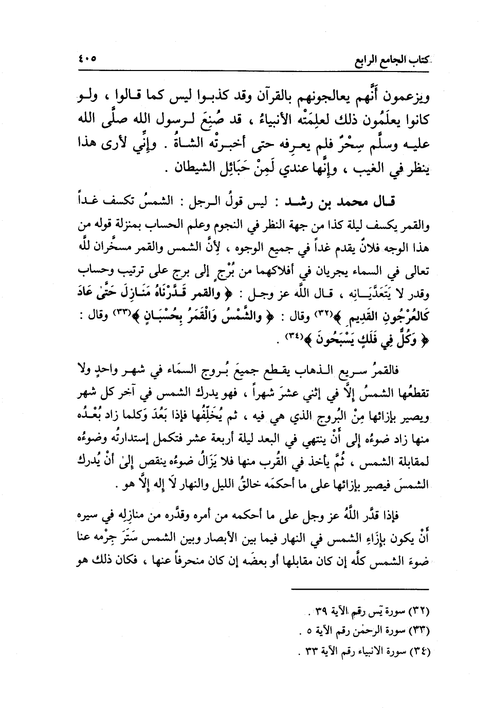 قال محمد بن رشد: ليس قول الرجل: الشمس تكسف غدا والقمر يكسف ليلة كذا - من جهة النظر في النجوم وعلم الحساب، بمنزلة قوله من هذا الوجه: فلان يقدم غدا، في جميع الوجوه؛ لأن الشمس والقمر مسخران لله تعالى في السماء يجريان في أفلاكهما من برج إلى برج على ترتيب وحساب وقدر لا يتعديانه، قال الله عز وجل: {وَالْقَمَرَ قَدَّرْنَاهُ مَنَازِلَ حَتَّى عَادَ كَالْعُرْجُونِ الْقَدِيمِ} [يس: 39] وقال: {الشَّمْسُ وَالْقَمَرُ بِحُسْبَانٍ} [الرحمن: 5] وقال: {وَكُلٌّ فِي فَلَكٍ يَسْبَحُونَ} [يس: 40] .