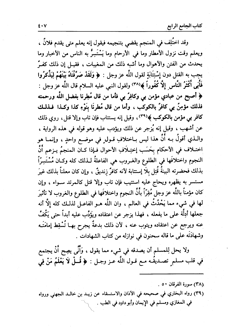 وقد اختلف في المنجم يقضي بتنجيمه، فيقول: إنه يعلم متى يقدم فلان، ويعلم وقت نزول الأمطار وما في الأرحام وما يستسر به الناس من الأخبار وما يحدث من الفتن والأهوال وما أشبه ذلك من المغيبات، فقيل: إن ذلك كفر يجب به القتل دون استتابة؛ لقول الله عز وجل: {وَلَقَدْ صَرَّفْنَاهُ بَيْنَهُمْ لِيَذَّكَّرُوا فَأَبَى أَكْثَرُ النَّاسِ إِلا كُفُورًا} [الفرقان: 50] ، ولقول النبي - عَلَيْهِ السَّلَامُ -: «قال الله عز وجل: أصبح من عبادي مؤمن بي وكافر بي، فأما من قال: مطرنا بفضل الله ورحمته، فذلك مؤمن بي كافر بالكوكب، وأما من قال: مطرنا بنوء كذا وكذا، فذلك كافر بي مؤمن بالكوكب» ، وقيل: إنه يستتاب فإن تاب وإلا قتل، روي ذلك عن أشهب، وقيل: إنه يزجر عن ذلك ويؤدب عليه، وهو قوله في هذه الرواية، والذي أقول به: إن هذا ليس باختلاف قول في موضع واحد، وإنما هو اختلاف في الأحكام بحسب اختلاف الأحوال، فإذا كان المنجم يزعم أن النجوم واختلافها في الطلوع والغروب هي الفاعلة لذلك كله وكان مستسرا بذلك فحضرته البينة قتل بلا استتابة؛ لأنه كافر زنديق، وإن كان معلنا بذلك غير مستسر به يظهره ويحاج عليه استتيب، فإن تاب وإلا قتل كالمرتد سواء، وإن كان مؤمنا بالله عز وجل مقرا بأن النجوم واختلافها في الطلوع والغروب لا تأثير لها في شيء مما يحدث في العالم، وأن الله هو الفاعل لذلك كله إلا أنه جعلها أدلة على ما يفعله، فهذا يزجر عن اعتقاده ويؤدب عليه أبدا حتى يكف عنه ويرجع عن اعتقاده ويتوب عنه؛ لأن ذلك بدعة يجرح بها، تسقط إمامته وشهادته على ما قاله سحنون في نوازله من كتاب الشهادات.