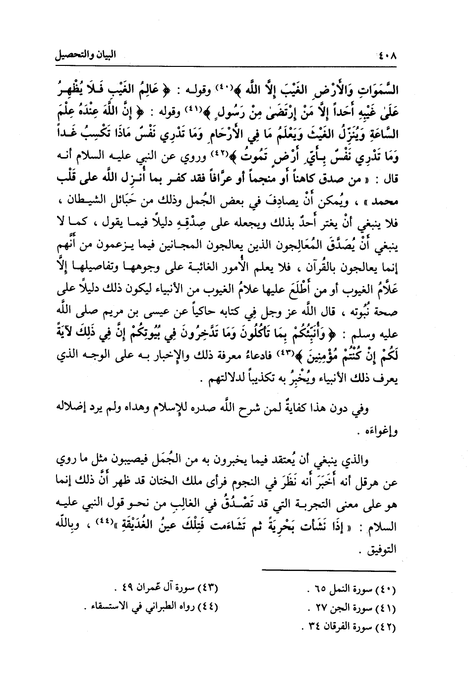 وقوله: {عَالِمُ الْغَيْبِ فَلا يُظْهِرُ عَلَى غَيْبِهِ أَحَدًا} [الجن: 26] {إِلا مَنِ ارْتَضَى مِنْ رَسُولٍ} [الجن: 27] وقوله: {إِنَّ اللَّهَ عِنْدَهُ عِلْمُ السَّاعَةِ وَيُنَزِّلُ الْغَيْثَ وَيَعْلَمُ مَا فِي الأَرْحَامِ وَمَا تَدْرِي نَفْسٌ مَاذَا تَكْسِبُ غَدًا وَمَا تَدْرِي نَفْسٌ بِأَيِّ أَرْضٍ تَمُوتُ} [لقمان: 34] ، وروي عن النبي - عَلَيْهِ السَّلَامُ - أنه قال: «من صدق كاهنا أو منجما أو عرافا فقد كفر بما أنزل الله على قلب محمد» ، ويمكن أن يصادف في بعض الجمل وذلك من حبائل الشيطان، فلا ينبغي أن يغتر أحد بذلك ويجعله على صدقه دليلا فيما يقول، كما لا ينبغي أن يصدق المعالجون الذين يعالجون المجانين فيما يزعمون من أنهم إنما يعالجون بالقرآن، فلا يعلم الأمور الغائبة على وجوهها وتفاصيلها إلا علام الغيوب أو من أطلع عليها علام الغيوب من الأنبياء ليكون ذلك دليلا على صحة نبوته، قال الله عز وجل في كتابه حاكيا عن عيسى ابن مريم - صَلَّى اللَّهُ عَلَيْهِ وَسَلَّمَ -: {وَأُنَبِّئُكُمْ بِمَا تَأْكُلُونَ وَمَا تَدَّخِرُونَ فِي بُيُوتِكُمْ إِنَّ فِي ذَلِكَ لآيَةً لَكُمْ إِنْ كُنْتُمْ مُؤْمِنِينَ} [آل عمران: 49] ، فادعاء معرفة ذلك والإخبار به على الوجه الذي يعرف ذلك الأنبياء ويخبر به تكذيبا لدلالتهم.