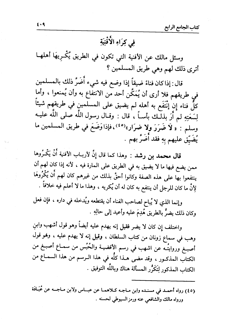 قال: إذا كان فناء ضيقا إذا وضع فيه شيء أضر ذلك بالمسلمين في طريقهم فلا أرى أن يمكن أحد من الانتفاع به وأن يمنعوا، وأما كل فناء إن انتفع به أهله لم يضيق على المسلمين في طريقهم شيئا لسعته لم أر بذلك بأسا، قال: وقال رسول الله - صَلَّى اللَّهُ عَلَيْهِ وَسَلَّمَ -: «لا ضرر ولا ضرار» ، فإذا وضع في طريق المسلمين ما يضيق عليهم به فقد أضر بهم.