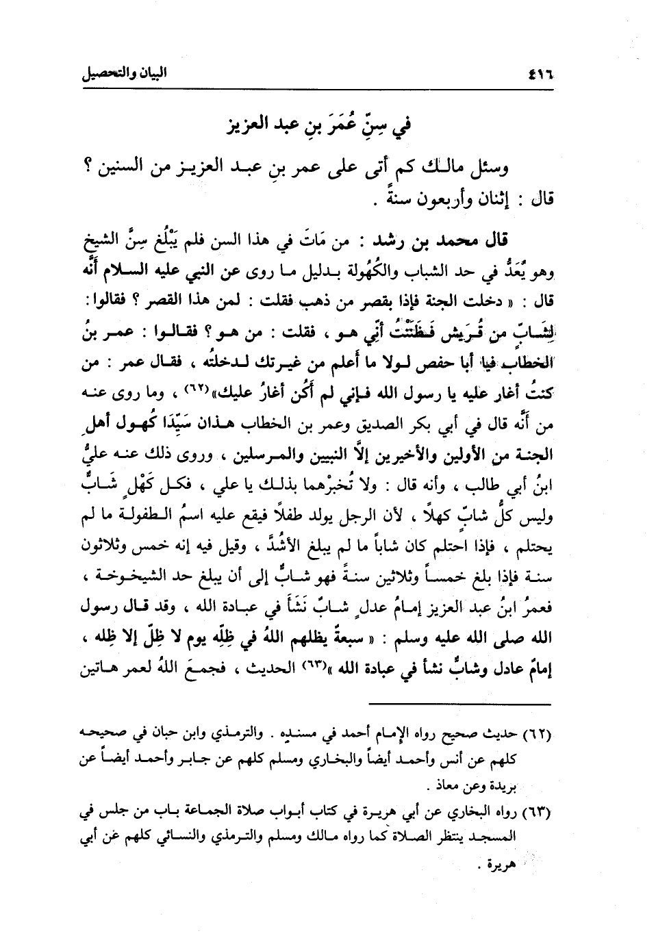 قال محمد بن رشد: من مات في هذا السن فلم يبلغ سن الشيخ وهو يعد في حد الشباب والكهولة بدليل ما روى عن النبي - عَلَيْهِ السَّلَامُ - أنه قال: «دخلت الجنة فإذا بقصر من ذهب، فقلت: لمن هذا القصر؟ فقالوا: لشاب من قريش فظننت أني هو، فقلت: من هو؟ فقالوا: عمر بن الخطاب، فيا أبا حفص لولا ما أعلم من غيرتك لدخلته، فقال عمر: من كنت أغار عليه يا رسول الله فإني لم أكن أغار عليك» . وما روى عنه من أنه قال في أبي بكر الصديق وعمر بن الخطاب: «هذان سيدا كهول أهل الجنة من الأولين والأخيرين إلا النبيين والمرسلين» . وروى ذلك عنه علي بن أبي طالب، وأنه قال: «ولا تخبرهما بذلك يا علي،» فكل كهل شاب وليس كل شاب كهلا؛ لأن الرجل يولد طفلا فيقع عليه اسم الطفولة ما لم يحتلم، فإذا احتلم كان شابا ما لم يبلغ الأشد، وقيل فيه: إنه خمس وثلاثون سنة فإذا بلغ خمسا وثلاثين سنة فهو شاب إلى أن يبلغ حد الشيخوخة، فعمر بن عبد العزيز إمام عدل شاب نشأ في عبادة الله، وقد قال رسول الله - صَلَّى اللَّهُ عَلَيْهِ وَسَلَّمَ -: «سبعة يظلهم الله في ظله يوم لا ظل إلا ظله: إمام عادل وشاب نشأ في عبادة الله ... » الحديث، فجمع الله لعمر هاتين