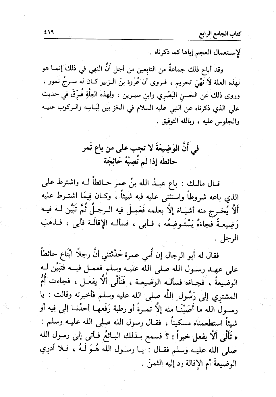 فقال له أبو الرجال: إن أمي عمرة حدثتني «أن رجلا ابتاع حائطا على عهد رسول الله - صَلَّى اللَّهُ عَلَيْهِ وَسَلَّمَ - فعمل فيه فتبين له الوضيعة، فجاءه فسأله الوضيعة، فتألى ألا يفعل، فجاءت أم المشتري إلى رسول الله - صَلَّى اللَّهُ عَلَيْهِ وَسَلَّمَ - فأخبرته، وقالت: يا رسول الله، ما أصبنا منه إلا تمرة أو رطبة رفعها أحدنا إلى فيه أو شيئا استطعمناه مسكينا، فقال رسول الله - صَلَّى اللَّهُ عَلَيْهِ وَسَلَّمَ -: " تألى ألا يفعل خيرا؟ " فسمع بذلك البائع فأتى إلى رسول الله - صَلَّى اللَّهُ عَلَيْهِ وَسَلَّمَ - فقال: يا رسول الله هو له» فلا أدري الوضيعة أم الإقالة رد إليه الثمن.