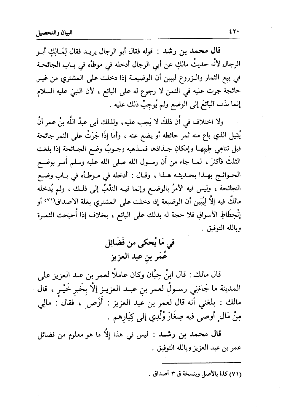 قال محمد بن رشد: قوله فقال أبو الرجال، يريد فقال لمالك أبو الرجال؛ لأنه حديث مالك عن أبي الرجال أدخله في موطئه في باب الجائحة في بيع الثمار والزروع ليبين أن الوضيعة إذا دخلت على المشتري من غير جائحة جرت عليه في الثمن لا رجوع له على البائع؛ لأن النبي - عَلَيْهِ السَّلَامُ - إنما ندب البائع إلى الوضع ولم يوجب ذلك عليه.