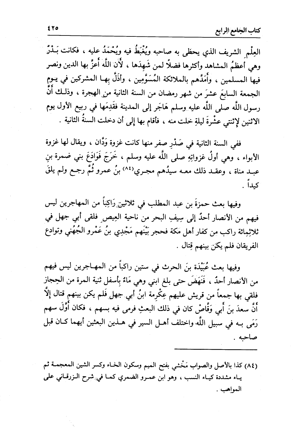 العلم الشريف الذي يحظى به صاحبه ويغبط فيه ويحمد عليه، فكانت بدر وهي أعظم المشاهد وأكثرها فضلا لمن شهدها؛ لأن الله أعز بها الدين ونصر فيها المسلمين، وأمدهم بالملائكة المسومين، وأذل بها المشركين في يوم الجمعة السابع عشر من شهر رمضان من السنة الثانية من الهجرة، وذلك أن رسول الله - صَلَّى اللَّهُ عَلَيْهِ وَسَلَّمَ - هاجر إلى المدينة فقدمها في ربيع الأول يوم الاثنين لاثنتي عشرة ليلة خلت منه، فأقام بها إلى أن دخلت السنة الثانية.