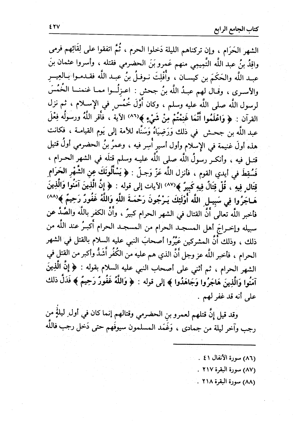 الشهر الحرام، وإن تركناهم الليلة دخلوا الحرم، ثم اتفقوا على لقائهم فرمى واقد بن عبد الله التميمي منهم عمرو بن الحضرمي فقتله، وأسروا عثمان بن عبد الله والحكم بن كيسان، وأفلت نوفل بن عبد الله، فقدموا بالعير والأسرى، وقال لهم عبد الله بن جحش: اعزلوا مما غنمنا الخمس لرسول الله - صَلَّى اللَّهُ عَلَيْهِ وَسَلَّمَ -، وكان أول خمس في الإسلام، ثم نزل القرآن: {وَاعْلَمُوا أَنَّمَا غَنِمْتُمْ مِنْ شَيْءٍ} [الأنفال: 41] الآية، فأقر الله ورسوله فعل عبد الله بن جحش في ذلك ورضياه وسناه للأمة إلى يوم القيامة، فكانت هذه أول غنيمة في الإسلام وأول أسير أسر فيه، وعمر بن الحضرمي أول قتيل قتل فيه، وأنكر رسول الله - صَلَّى اللَّهُ عَلَيْهِ وَسَلَّمَ - قتله في الشهر الحرام، فسقط في أيدي القوم، فأنزل الله عز وجل: {يَسْأَلُونَكَ عَنِ الشَّهْرِ الْحَرَامِ قِتَالٍ فِيهِ قُلْ قِتَالٌ فِيهِ كَبِيرٌ} [البقرة: 217] الآيات إلى قوله: {إِنَّ الَّذِينَ آمَنُوا وَالَّذِينَ هَاجَرُوا وَجَاهَدُوا فِي سَبِيلِ اللَّهِ أُولَئِكَ يَرْجُونَ رَحْمَتَ اللَّهِ وَاللَّهُ غَفُورٌ رَحِيمٌ} [البقرة: 218] ، فأخبر الله تعالى أن القتال في الشهر الحرام كبير، وأن الكفر بالله والصد عن سبيله وإخراج أهل المسجد الحرام من المسجد الحرام أكبر عند الله من ذلك، وذلك أن المشركين عيروا أصحاب النبي - عَلَيْهِ السَّلَامُ - بالقتل في الشهر الحرام، فأخبر الله عز وجل أن الذي هم عليه من الكفر أشد وأكبر من القتل في الشهر الحرام، ثم أثنى على أصحاب النبي - عَلَيْهِ السَّلَامُ - بقوله: {إِنَّ الَّذِينَ آمَنُوا وَهَاجَرُوا وَجَاهَدُوا بِأَمْوَالِهِمْ} [الأنفال: 72] إلى قوله: {وَاللَّهُ غَفُورٌ رَحِيمٌ} [الأنفال: 70] فدل ذلك على أنه قد غفر لهم.