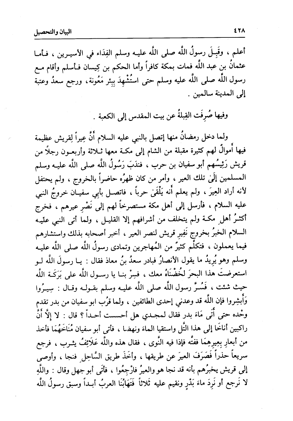 ولما دخل رمضان منها اتصل بالنبي - عَلَيْهِ السَّلَامُ - أن عيرا لقريش عظيمة فيها أموال لهم كثيرة مقبلة من الشام إلى مكة معها ثلاثة وأربعون رجلا من قريش رئيسهم أبو سفيان بن حرب، فندب رسول الله - صَلَّى اللَّهُ عَلَيْهِ وَسَلَّمَ - المسلمين إلى تلك العير، وأمر من كان ظهره حاضرا بالخروج، ولم يحتفل لأنه أراد العير، ولم يعلم أنه يلقى حربا، فاتصل بأبي سفيان خروج النبي - عَلَيْهِ السَّلَامُ -، فأرسل إلى أهل مكة مستصرخا لهم إلى نصر عيرهم، فخرج أكثر أهل مكة ولم يتخلف من أشرافهم إلا القليل، ولما أتى النبي - عَلَيْهِ السَّلَامُ - الخبر بخروج نفير قريش لنصر العير، أخبر أصحابه بذلك واستشارهم فيما يعملون، فتكلم كثير من المهاجرين وتمادى رسول الله - صَلَّى اللَّهُ عَلَيْهِ وَسَلَّمَ - وهو يريد ما يقول الأنصار، فبادر سعد بن معاذ فقال: يا رسول الله، لو استعرضت هذا البحر لخضناه معك، فسر بنا يا رسول الله على بركة الله حيث شئت. فسر رسول الله - صَلَّى اللَّهُ عَلَيْهِ وَسَلَّمَ - بقوله، وقال: سيروا وأبشروا، فإن الله قد وعدني إحدى الطائفين. ولما قرب أبو سفيان من بدر تقدم وحده حتى أتى ماء بدر، فقال لمجدي: هل أحسست أحدا؟ قال: لا، إلا أن راكبين أناخا إلى هذا التل واستقيا الماء ونهضا، فأتى أبو سفيان مناخهما فأخذ من أبعار بعيرهما ففته، فإذا فيه النوى، فقال: هذه والله علائف يثرب، فرجع سريعا حذرا، فصرف العير عن طريقها، وأخذ طريق الساحل فنجا، وأوصى إلى قريش يخبرهم بأنه قد نجا هو والعير فارجعوا، فأتى أبو جهل، وقال: والله لا نرجع أو نرد ماء بدر ونقيم عليه ثلاثا فتهابنا العرب أبدا وسبق رسول الله