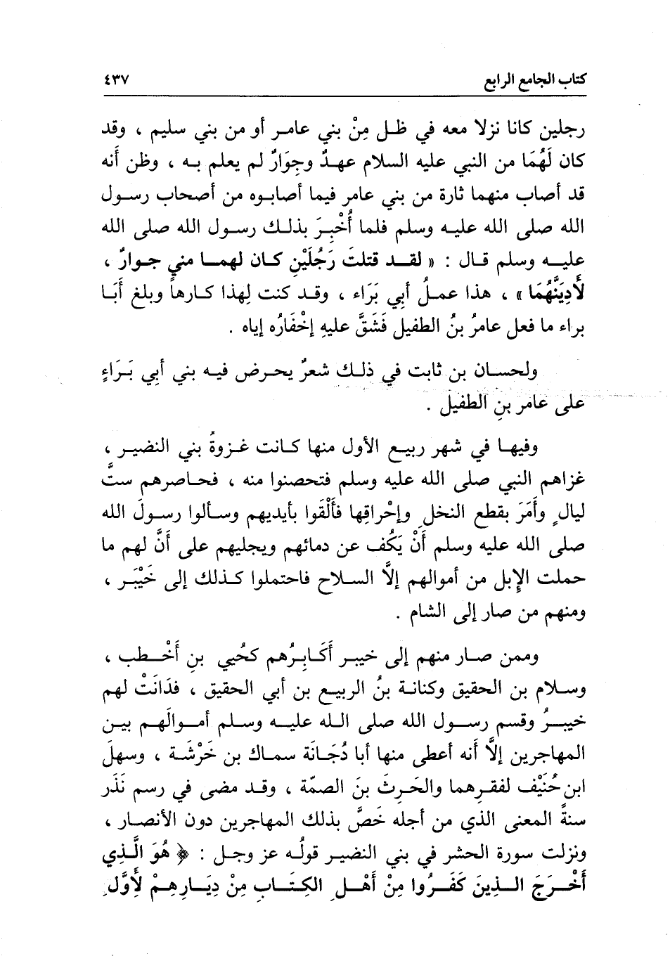 وممن صار منهم إلى خيبر أكابرهم كحيي بن أخطب، وسلام بن الحقيق، وكنانة بن الربيع بن أبي الحقيق، فدانت لهم خيبر، وقسم رسول الله - صَلَّى اللَّهُ عَلَيْهِ وَسَلَّمَ - أموالهم بين المهاجرين إلا أنه أعطى منها أبا دجانة سماك بن خرشة، وسهل بن حنيف لفقرهما، والحارث بن الصمة، وقد مضى في رسم نذر سنة، المعنى الذي من أجله خص بذلك المهاجرين دون الأنصار، ونزلت سورة الحشر في بني النضير قوله عز وجل: {هُوَ الَّذِي أَخْرَجَ الَّذِينَ كَفَرُوا مِنْ أَهْلِ الْكِتَابِ مِنْ دِيَارِهِمْ لأَوَّلِ الْحَشْرِ} [الحشر: 2]